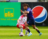 Sigfús er að komast í góða stöðu við mark Leiknis og Þorsteinn tekur hann niður.