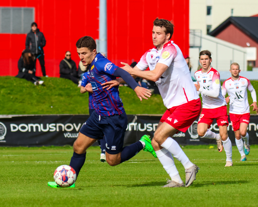 Einar Freyr fer full harkalega í Kára Stein á miðjum velli en sleppir við spjald hjá ÞÞÞ.