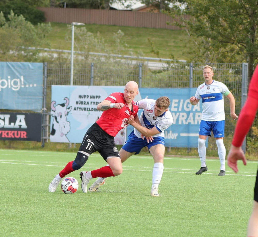 Svakaleg móttaka hjá Hákoni Degi á vinstri kantinum. Hann heldur svo boltanum á lofti á meðan hann færist inn á teiginn. Varnarmenn ná svo á endanum að komast í hann og hreinsa frá.