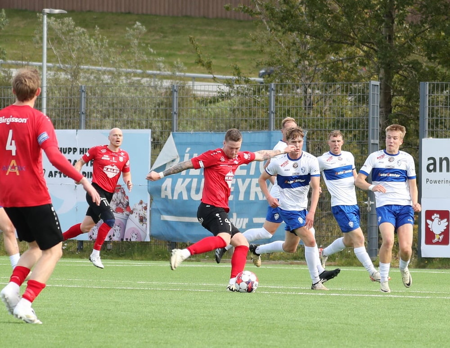 Elmar setur boltan inn í teiginn og Aron fær boltan inn í teig. Hann hittir ekki boltan en boltinn skoppar af honum og til Sigurpáls. Sigurpáll tekur þá skotið úr góðri stöðu en boltið framhjá.
