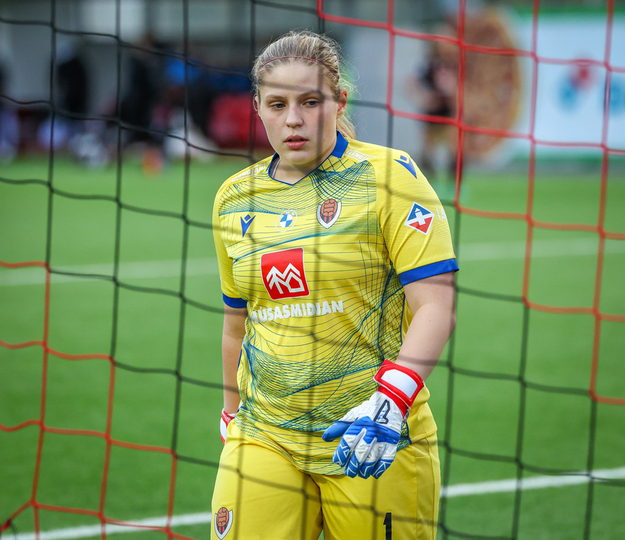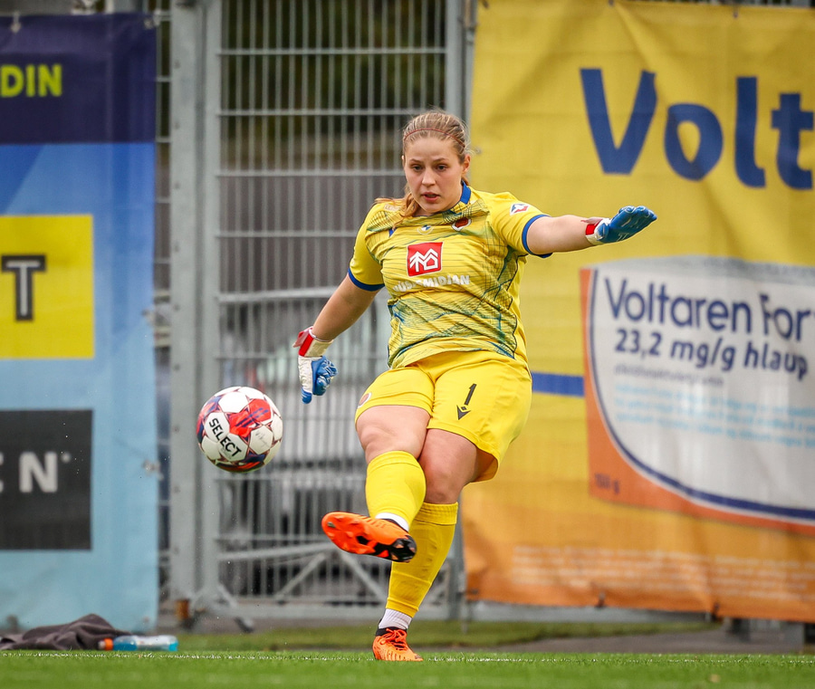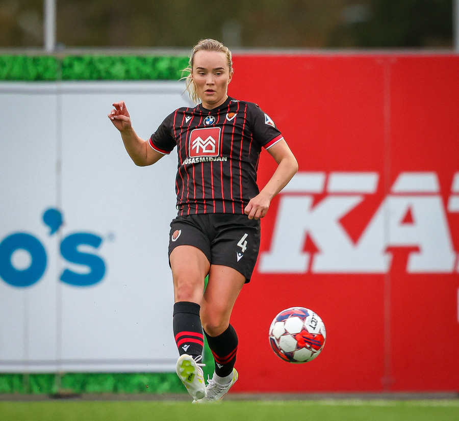 Caroline keyrir upp völlinn og tekur skot á markið sem Sigurborg ver aftur fyrir og í horn.