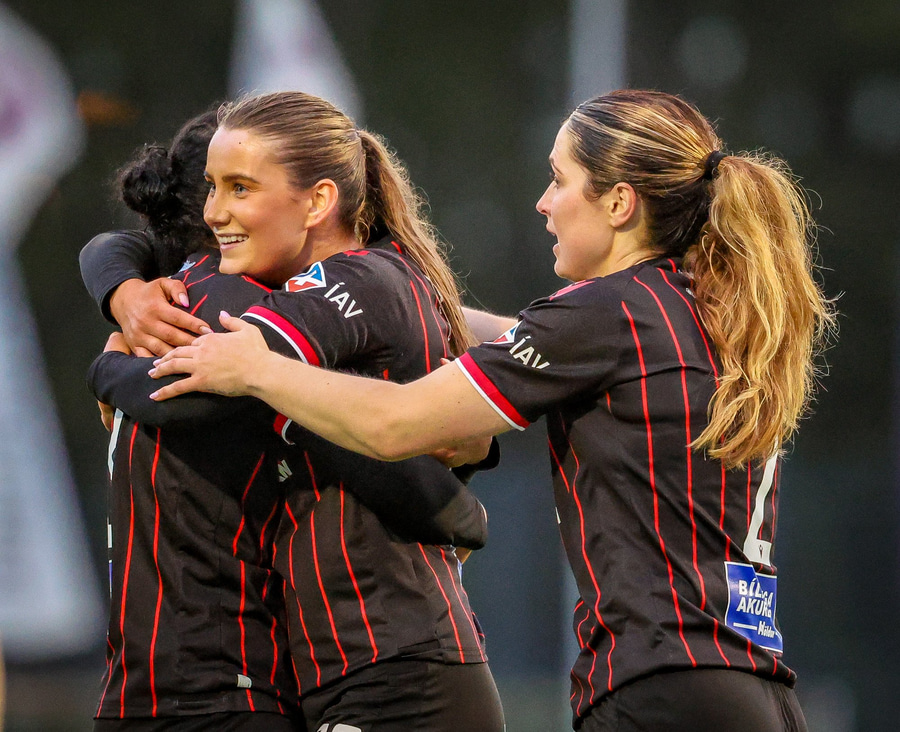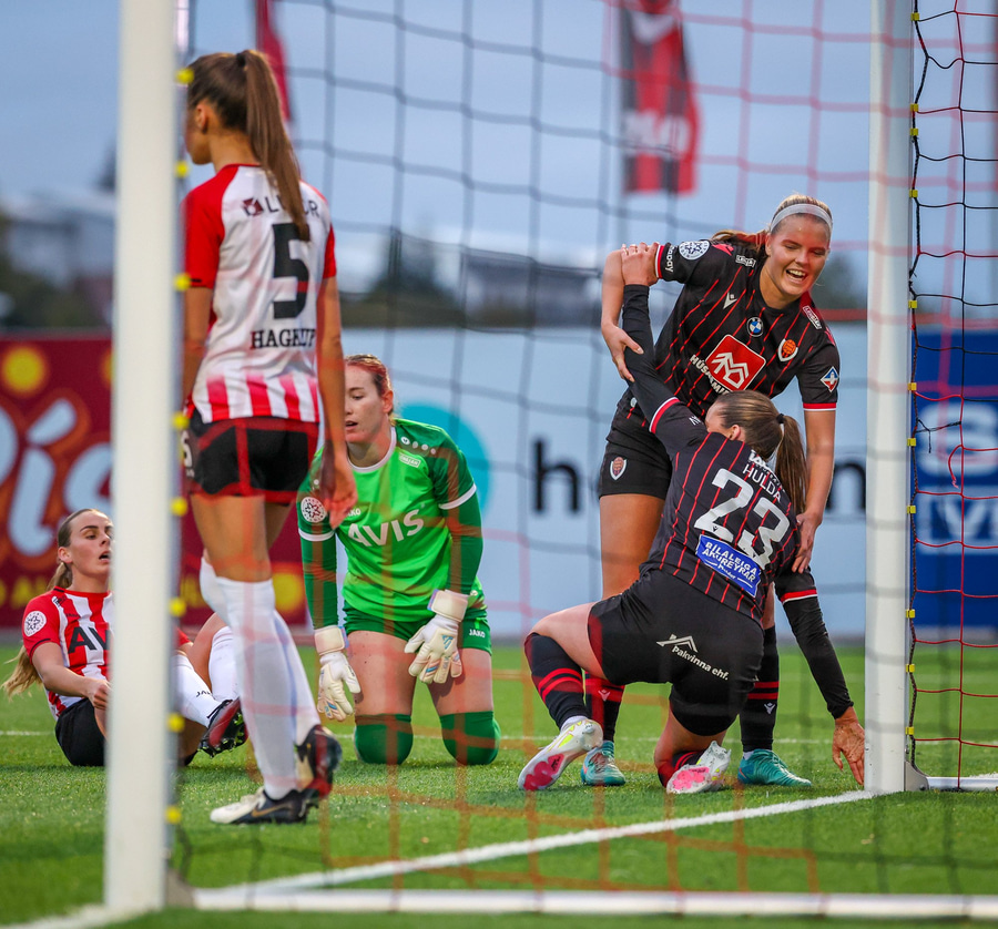 Emma Steinsen kemur með sendingu fyrir markið sem ratar á Huldu á fjærstönginni sem klárar framhjá Mollee.