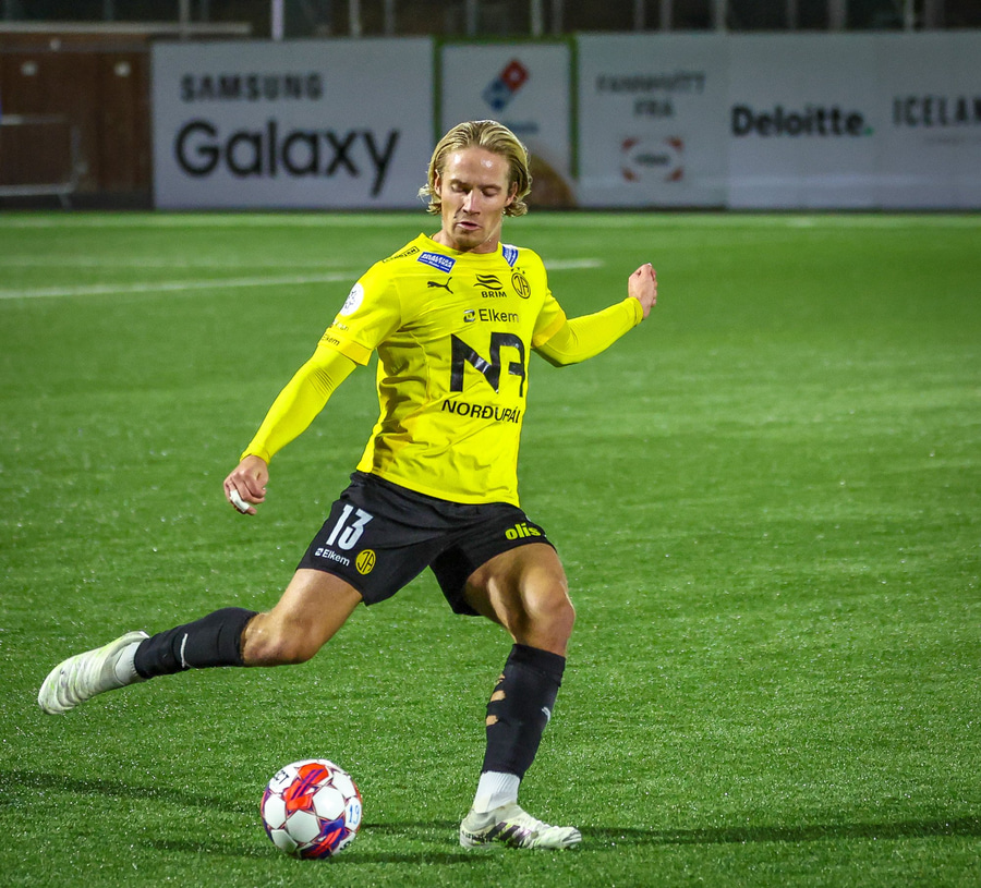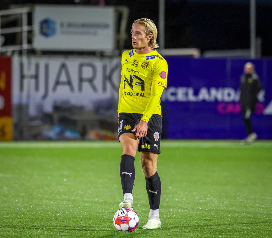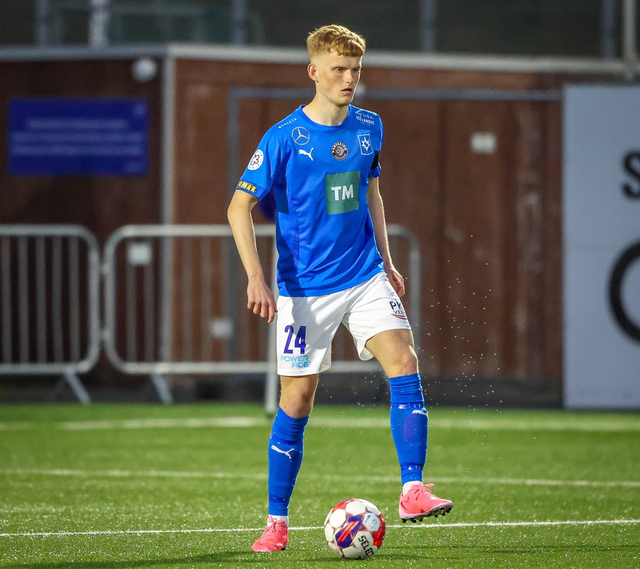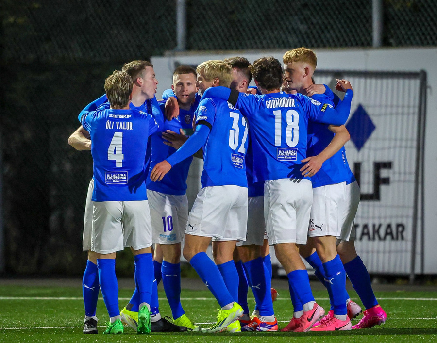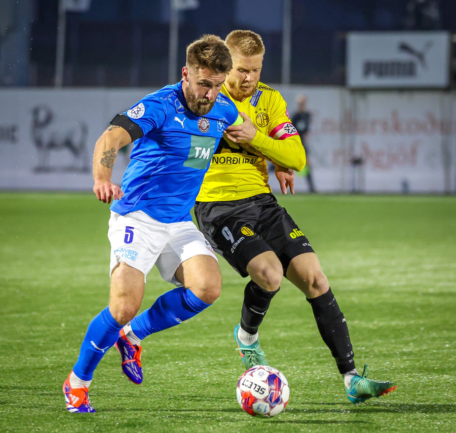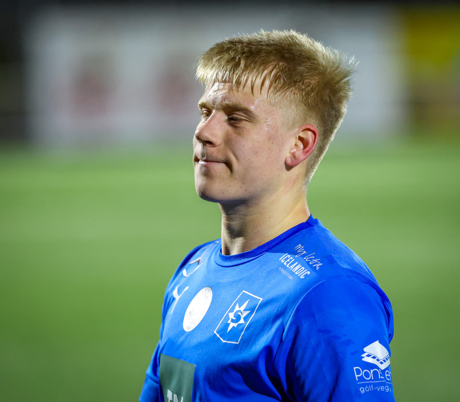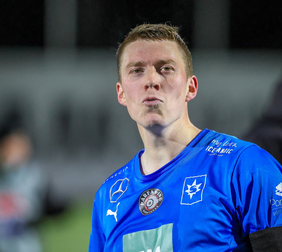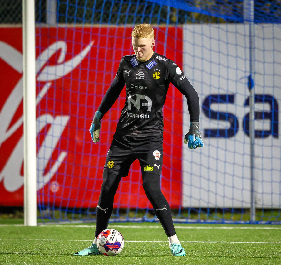 Johannes Vall er mættur niður á marklínu til að hreinsa boltann en fær hann í sig og boltinn fór yfir línuna áður en hann náði að hreinsa frá.
