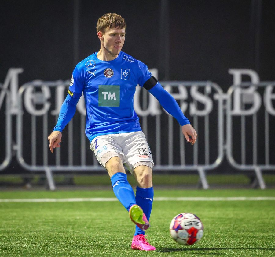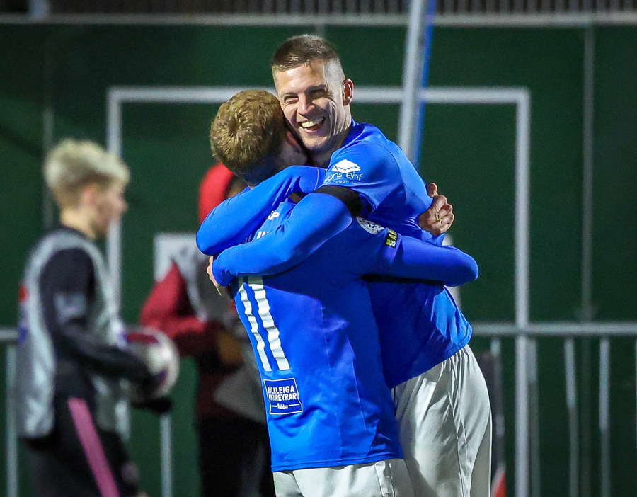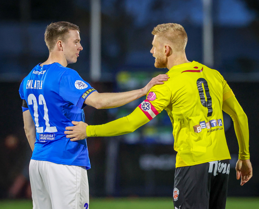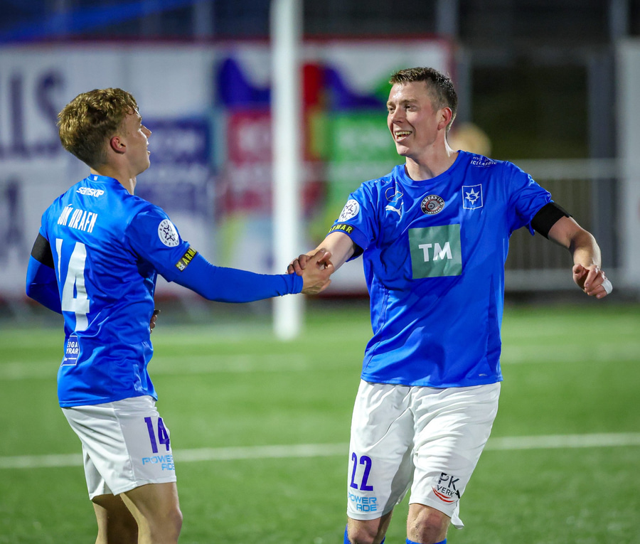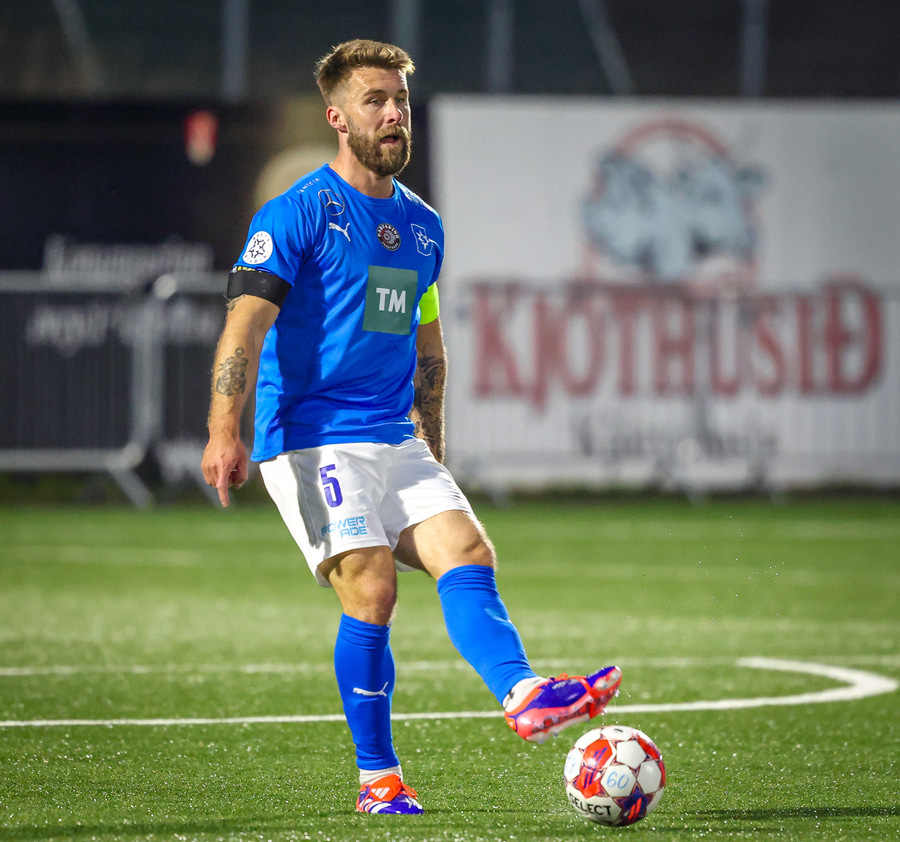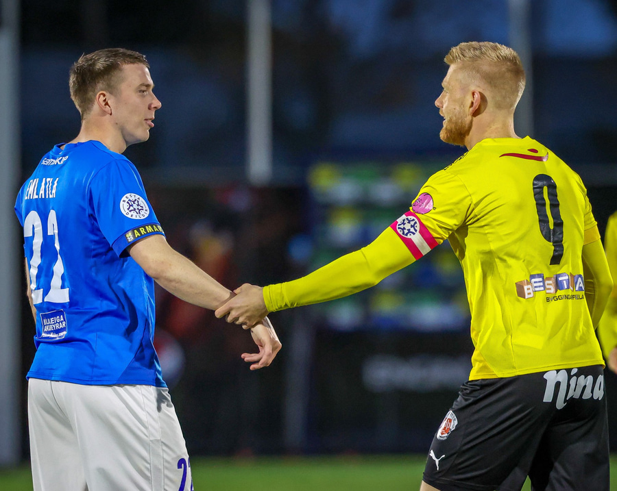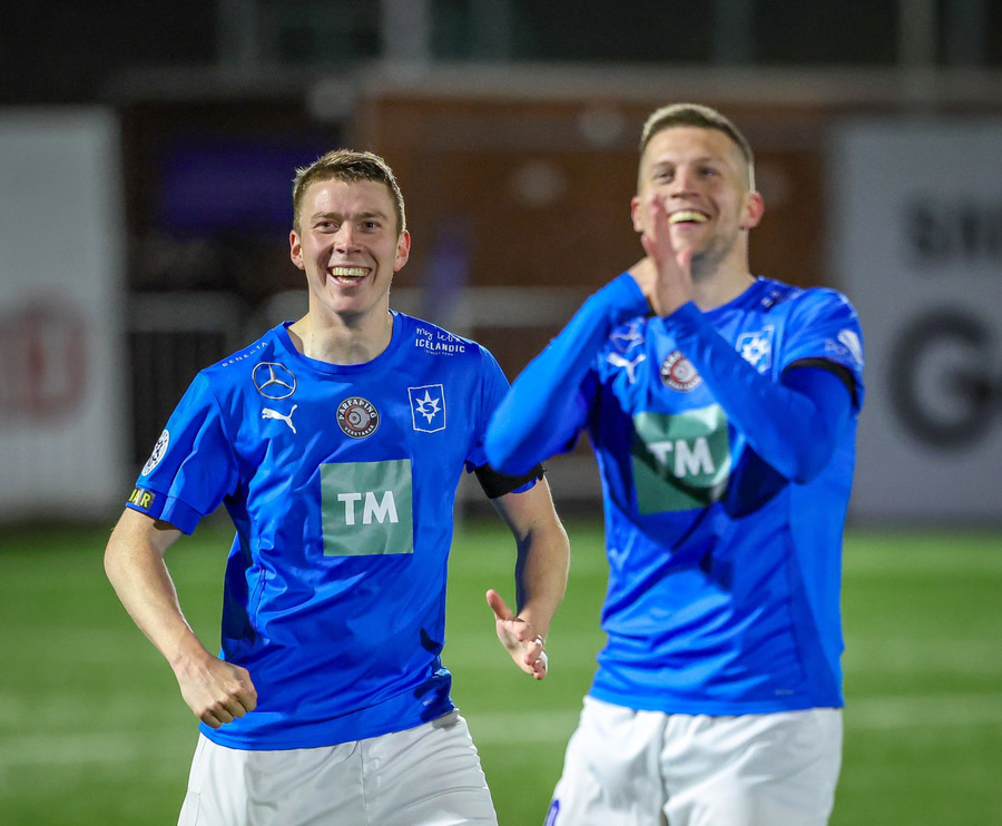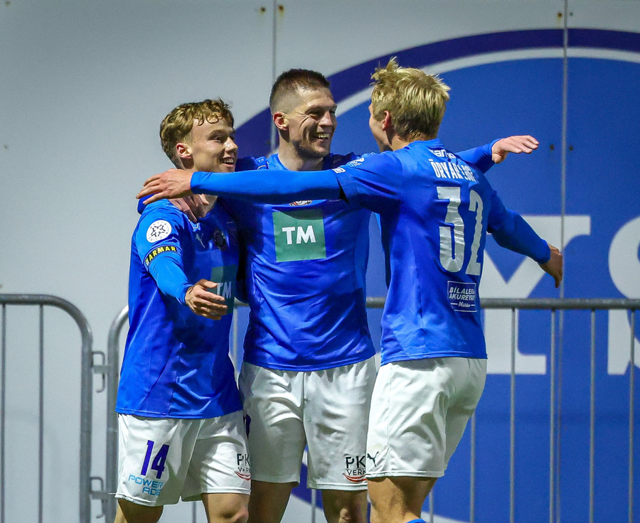 Johannes Vall er mættur niður á marklínu til að hreinsa boltann en fær hann í sig og boltinn fór yfir línuna áður en hann náði að hreinsa frá.