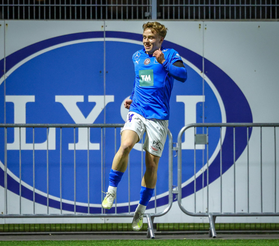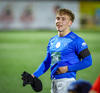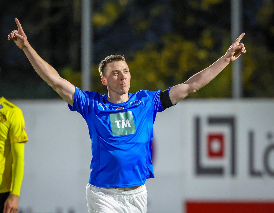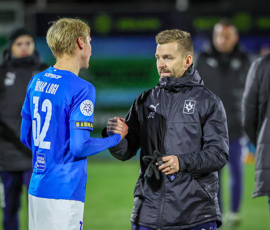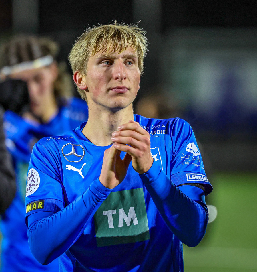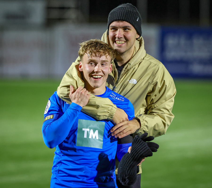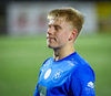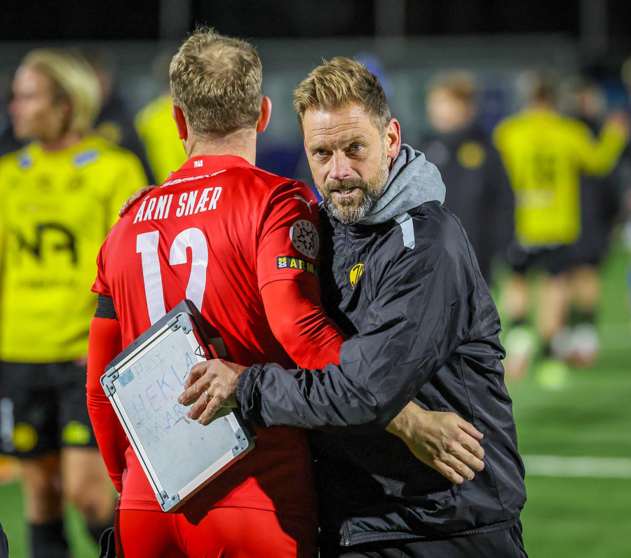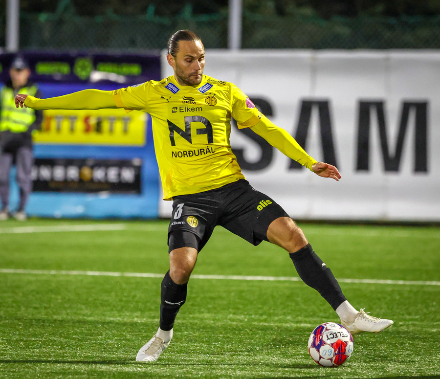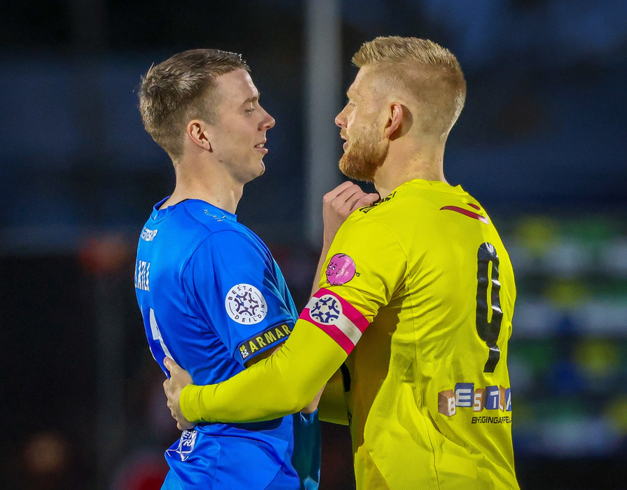 Johannes Vall er mættur niður á marklínu til að hreinsa boltann en fær hann í sig og boltinn fór yfir línuna áður en hann náði að hreinsa frá.