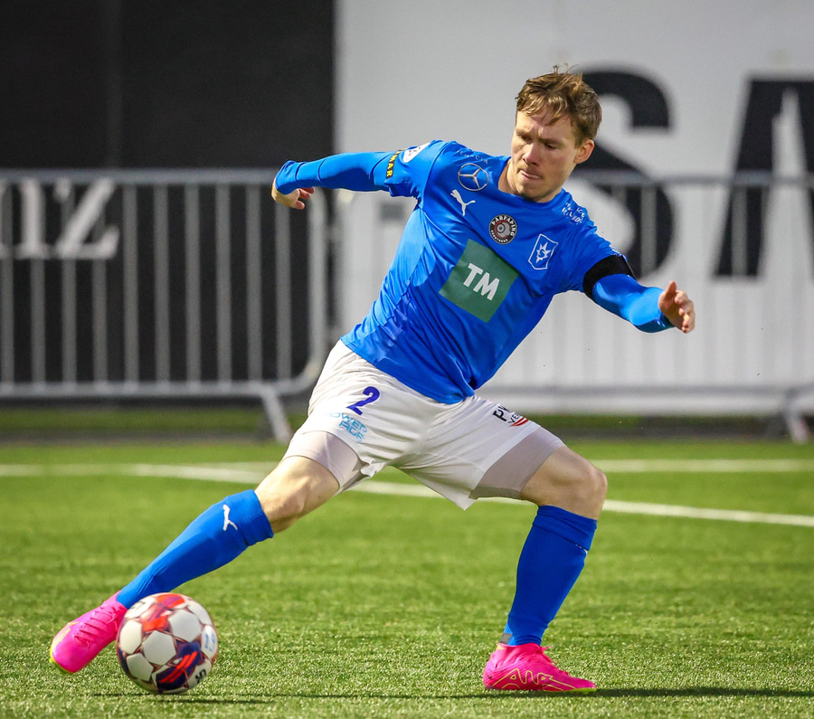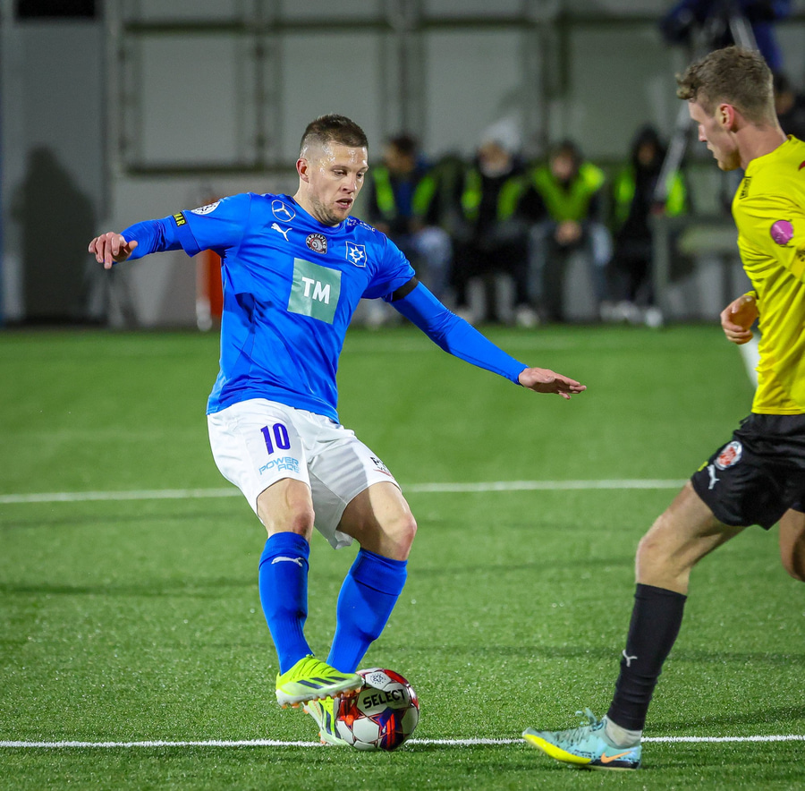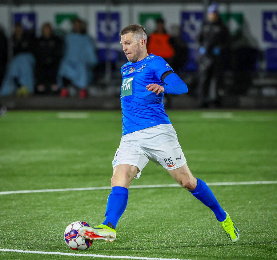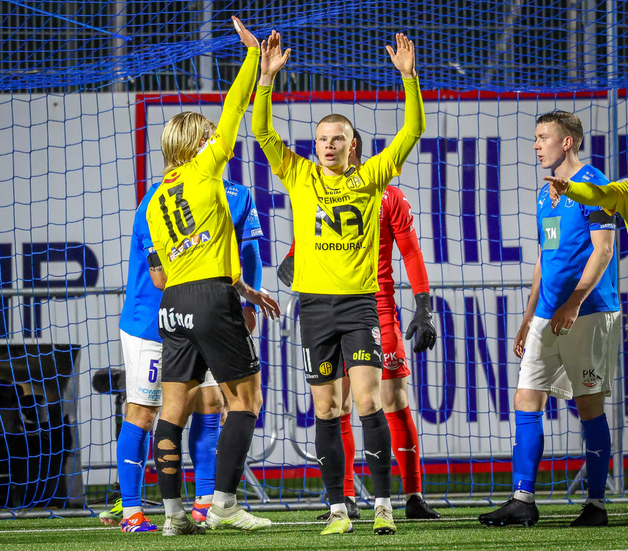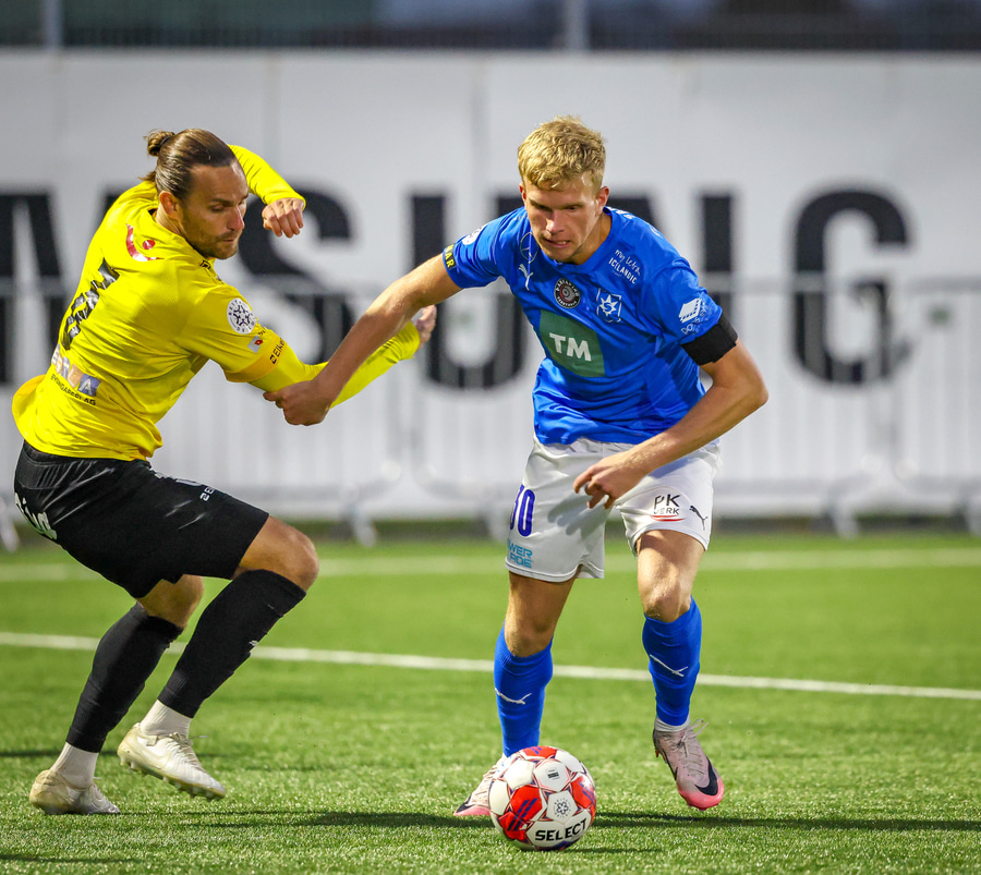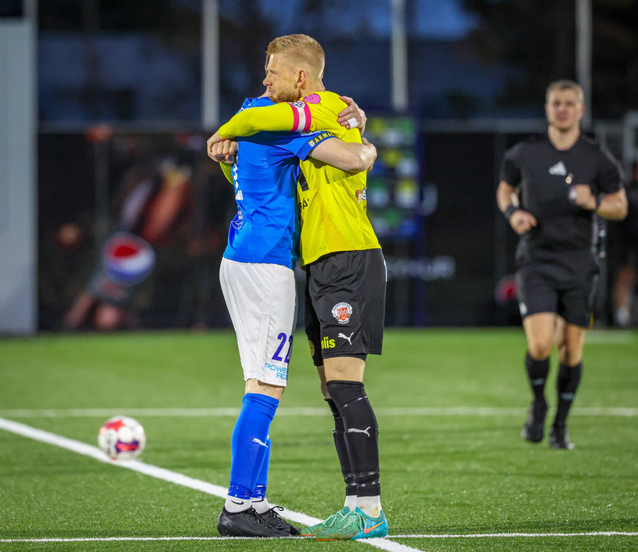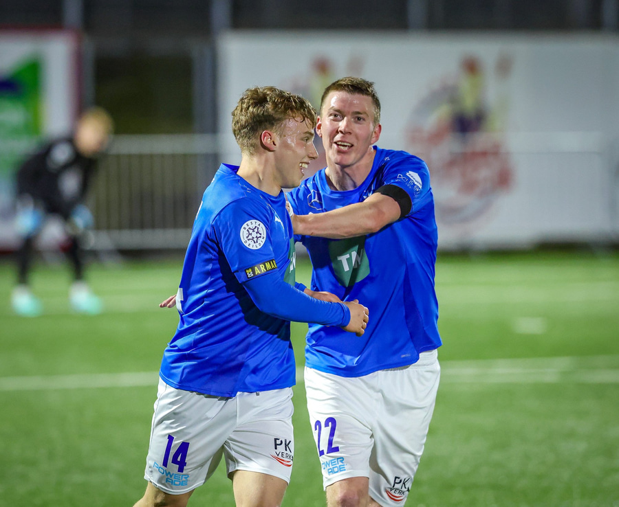 Johannes Vall er mættur niður á marklínu til að hreinsa boltann en fær hann í sig og boltinn fór yfir línuna áður en hann náði að hreinsa frá.