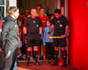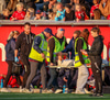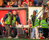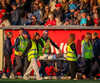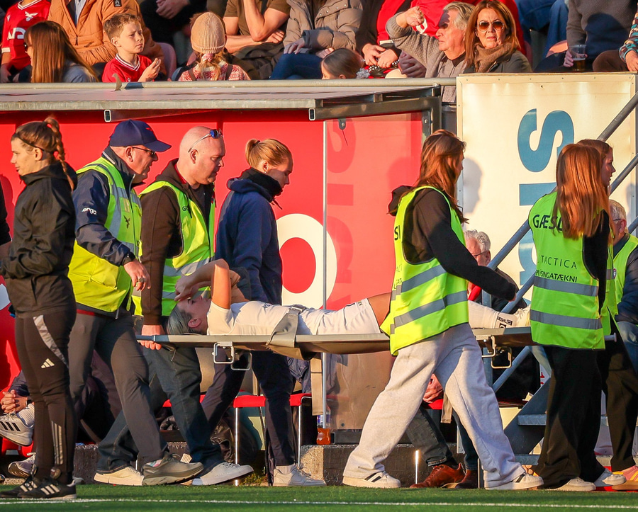 Leikurinn hefur verið stopp í þrjár mínútur og núna eru börurnar mættar. Eins og ég segi þá lítur þetta hræðilega út.