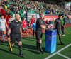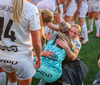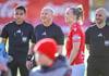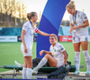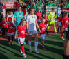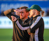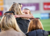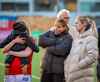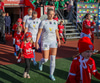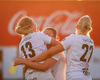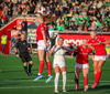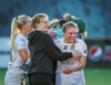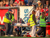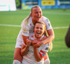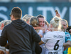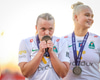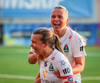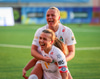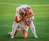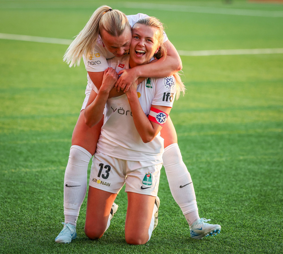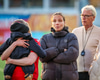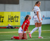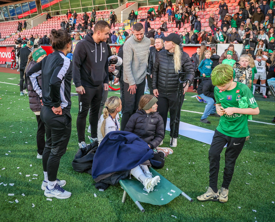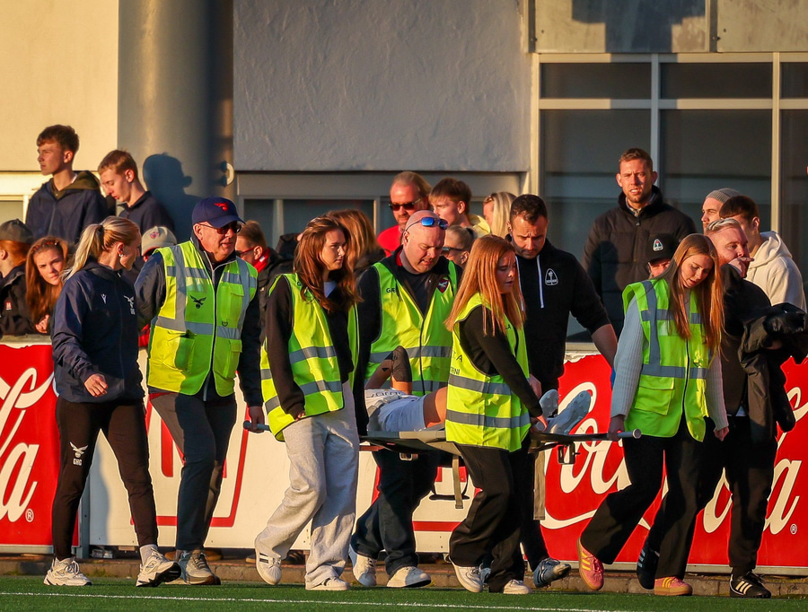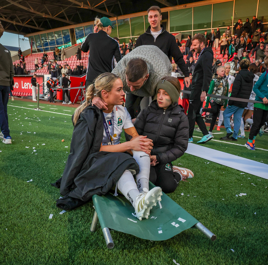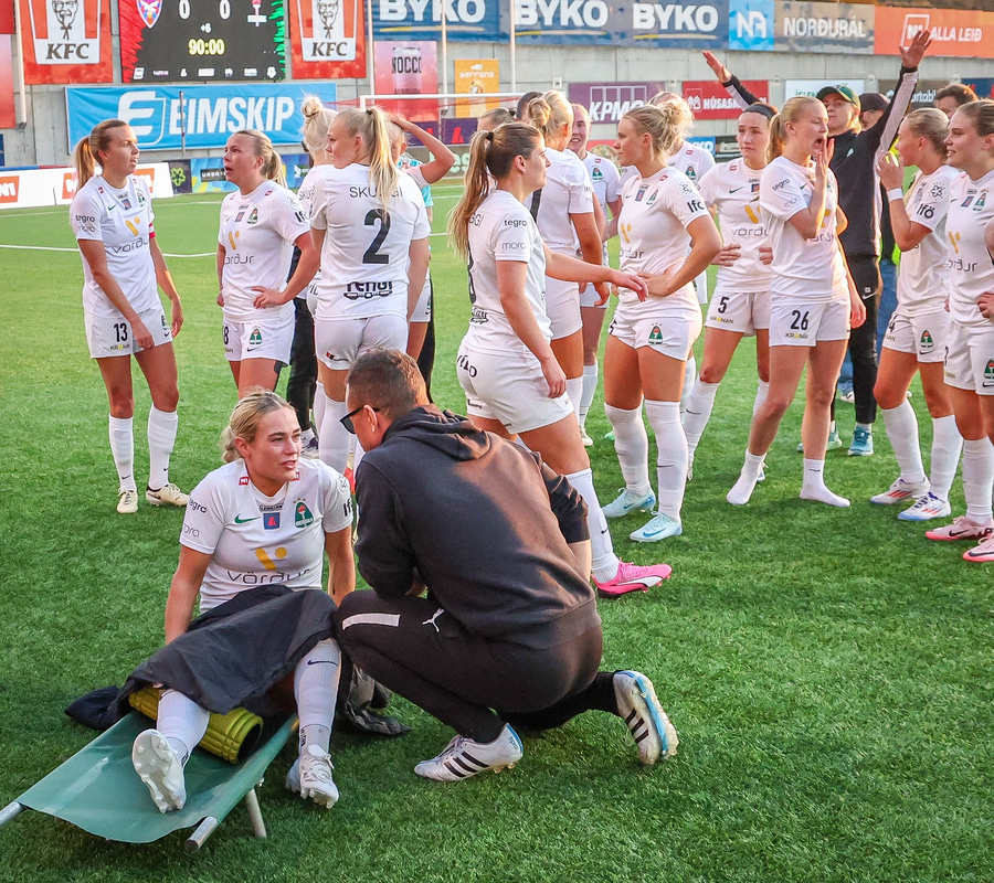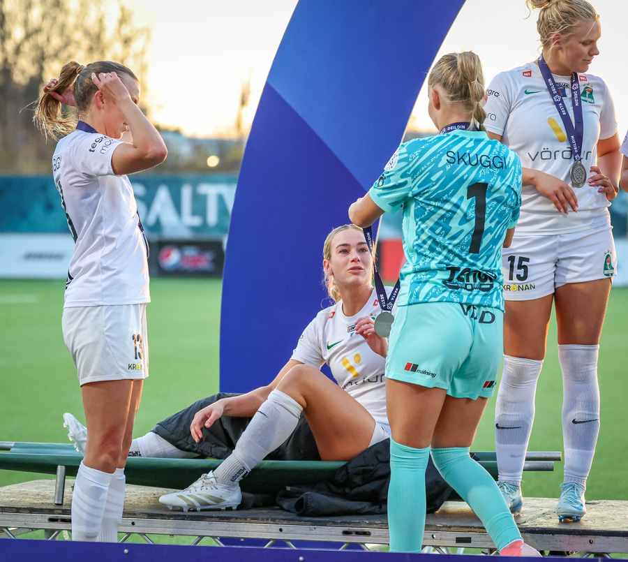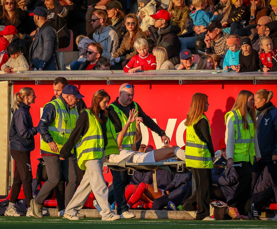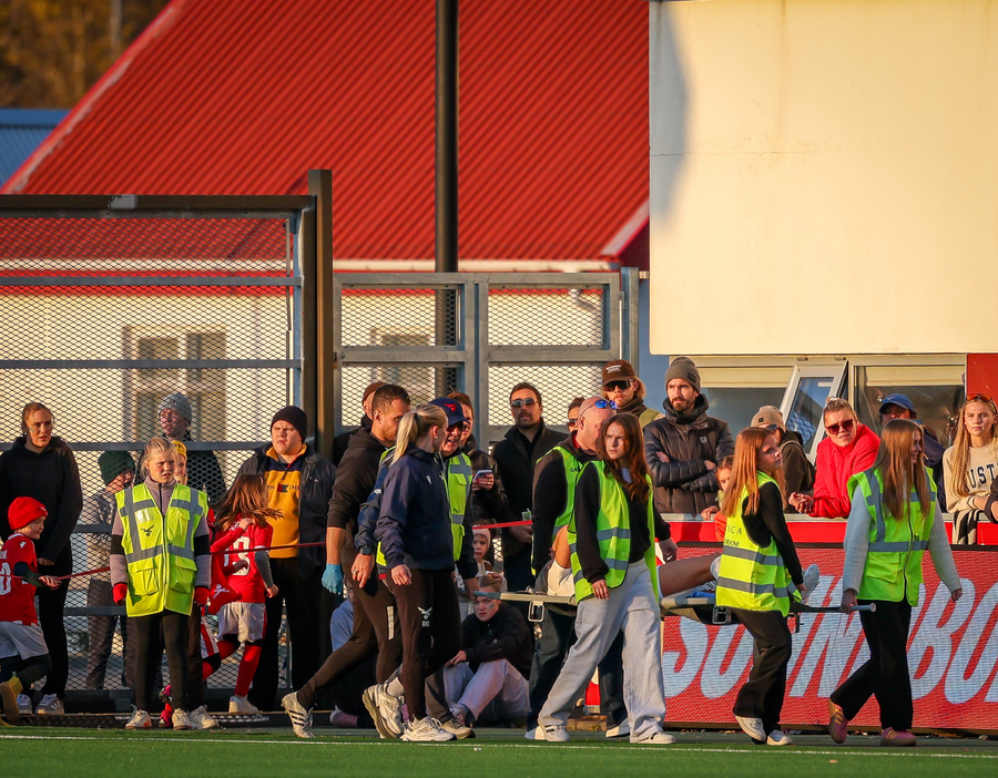 Þær standa nú á fætur og ganga af vellinum með sjúkraþjálfurunum. Vonandi hefur þetta engar afleiðingar.