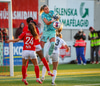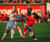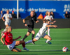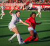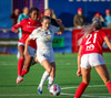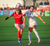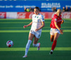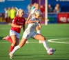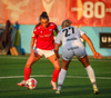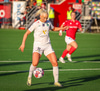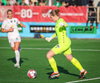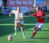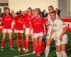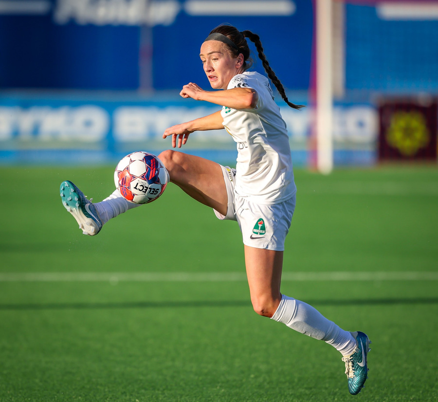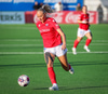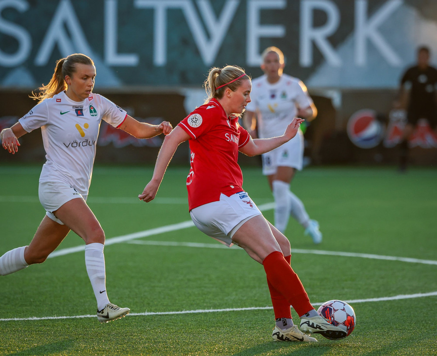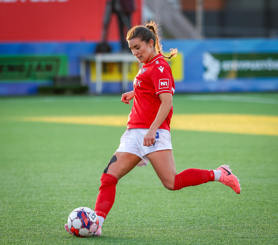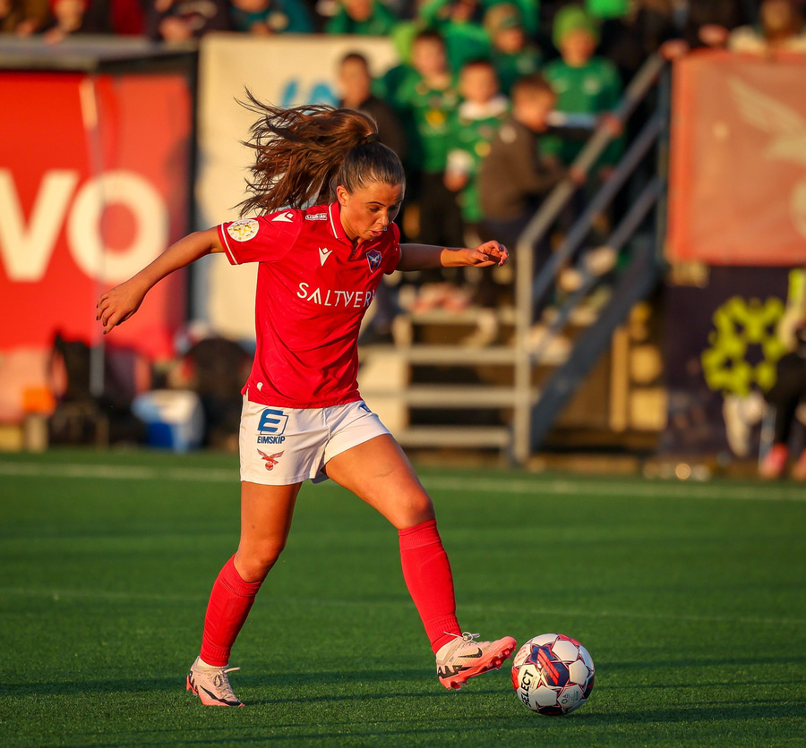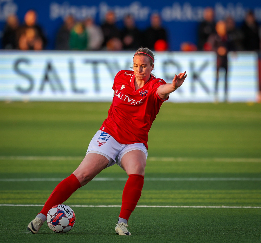 Agla María tekur spyrnuna inn á teiginn sem Samantha Smith nær til og tekur skotið í fyrsta sem fer yfir markið.