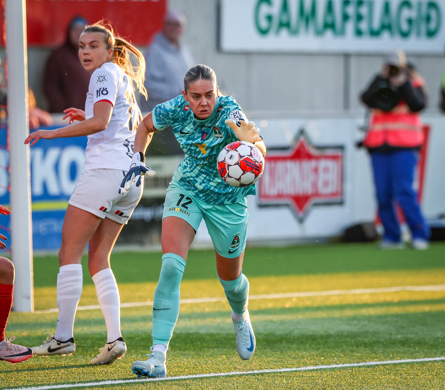 Katrín er skyndilega sloppin ein í gegn ein á móti Fanneyju en tekur skotið sem fer rétt framhjá.
