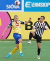 Viðar Örn Kjartansson sleppur einn í gegn en Alex Þór Hauksson nær honum og með frábæra tæklingu. Stúkan kallar eftir víti en held að þetta hafi bara verið frábær tækling, Viðar kvartar allavega ekki.