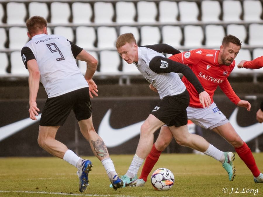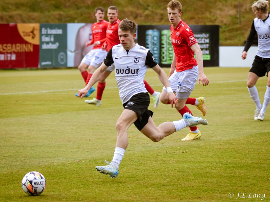 Kristján Flóki með heldur slaka sendingu fyrir sem Jakob Franz missir undir sólann en blessunarlega fyrir hann þá er Orri Sigurður fyrir aftan og hann kemur boltanum frá.