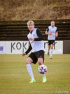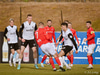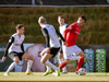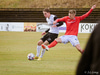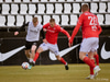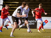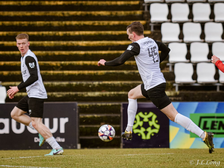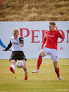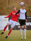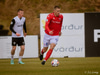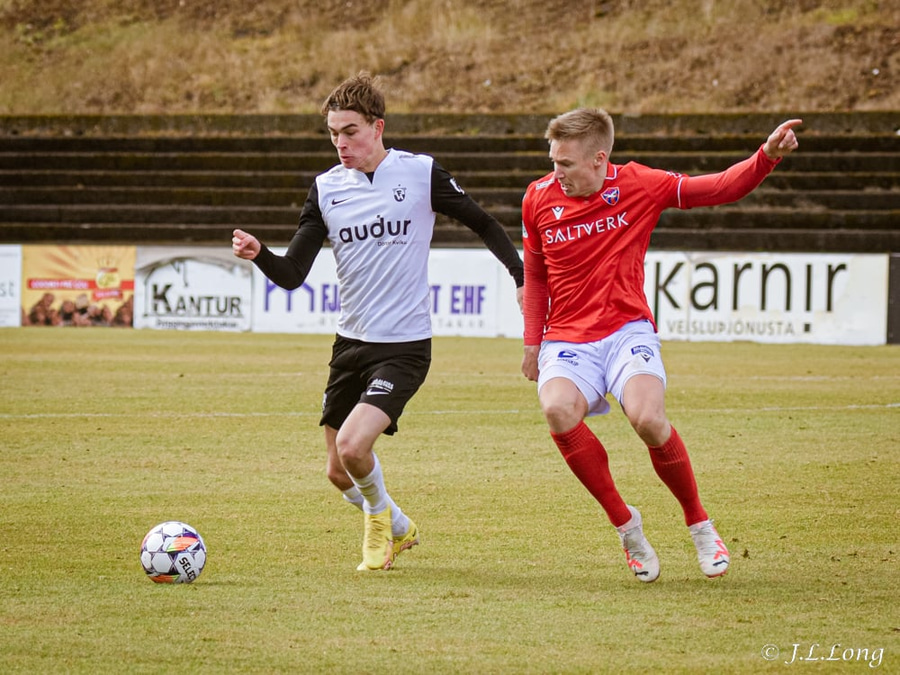 Valsmenn grimmir og Kristinn Freyr tekur boltann af Grétari Snær og keyrir í átt að marki. Finnur Gylfa Þór vinstra meginn við sig en skotið hans blokkað af varnarmanni.