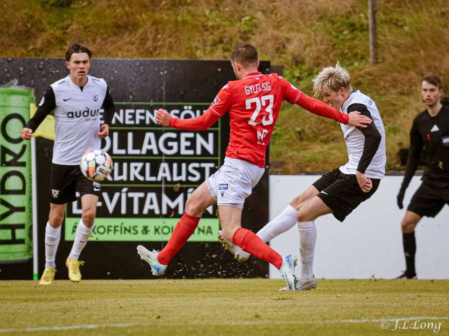 Albin Skoglund með flotta rispu og kemur sér inn á teig og á fastan bolta fyrir sem fer af Gylfa Þór í Sindra Kristinn og aftur fyrir.