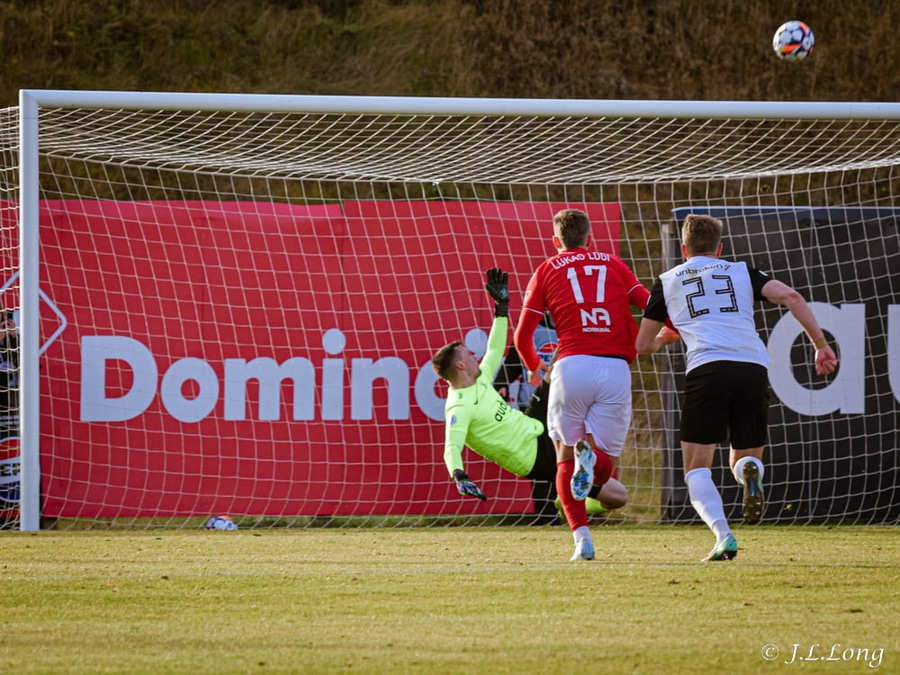 Opnaðist allt vinsta meginn fyrir Lúkas Loga og hann lætur vaða en Sindri Kristinn ver frá honum.