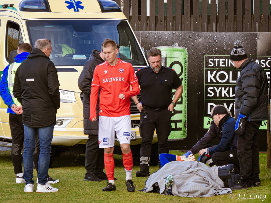 Ögmundur liggur eftir samstuð við Sigurð Bjart.