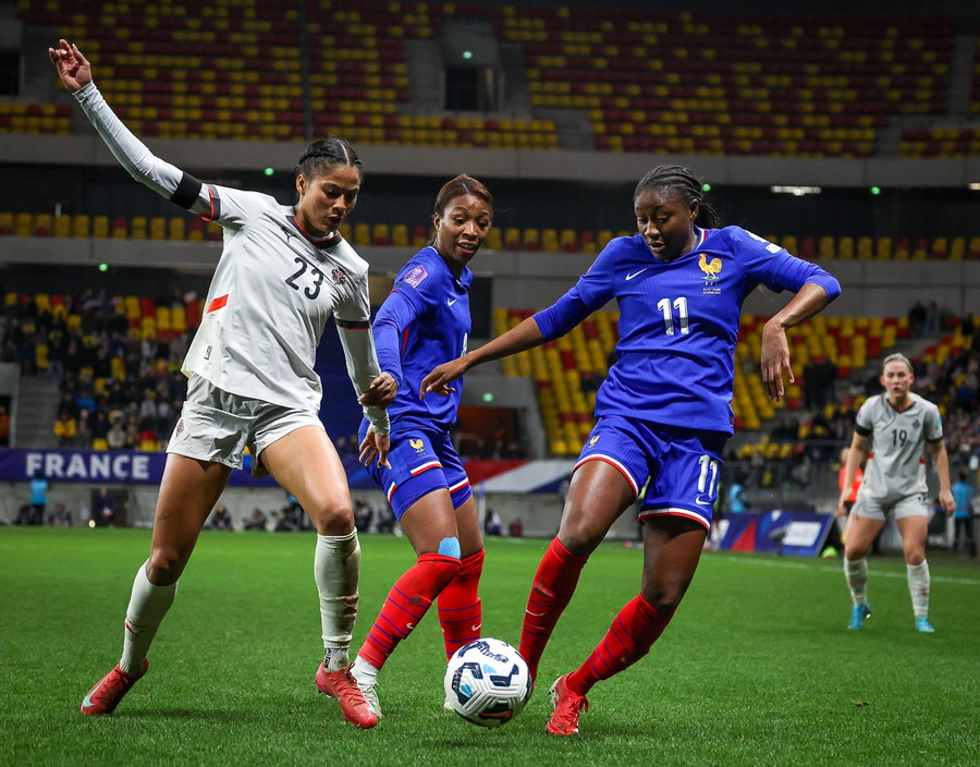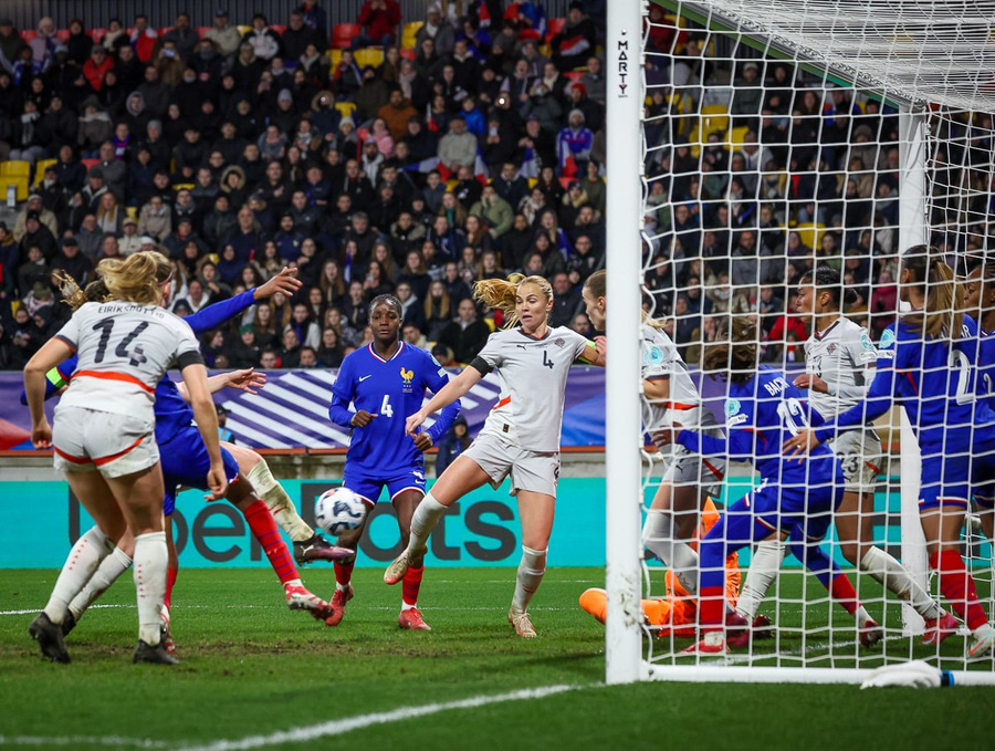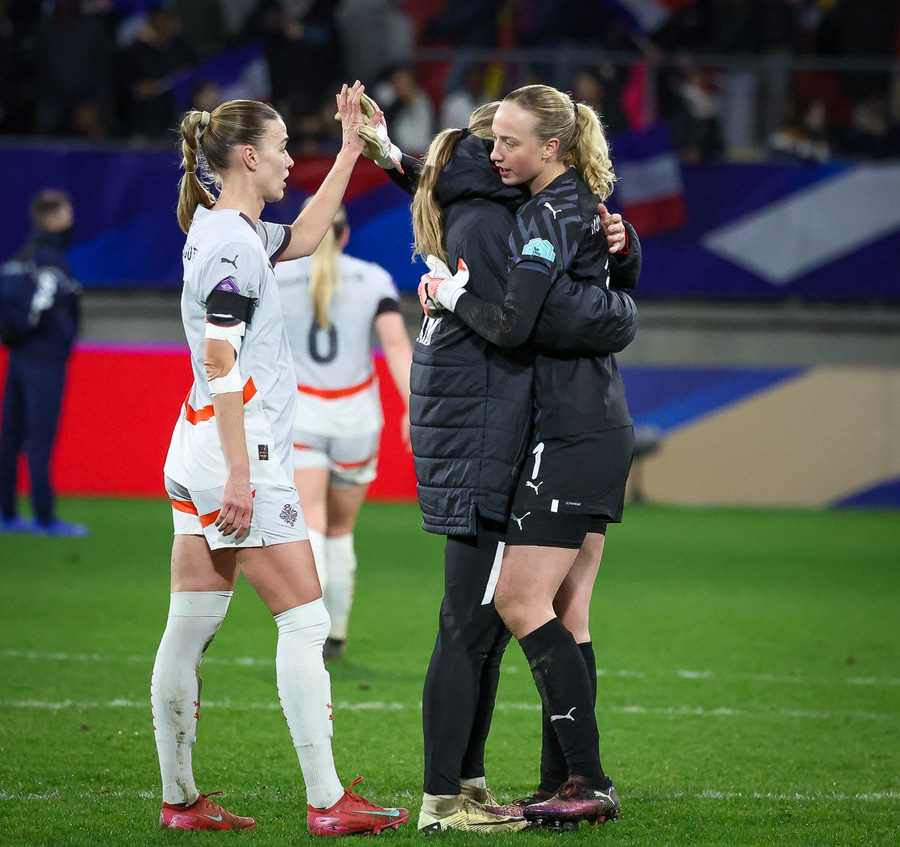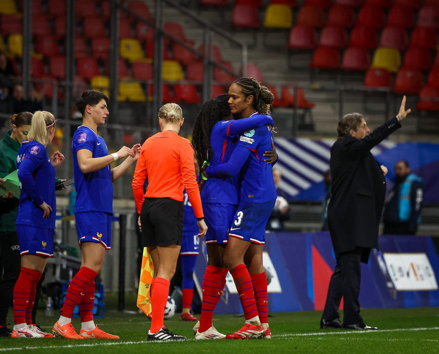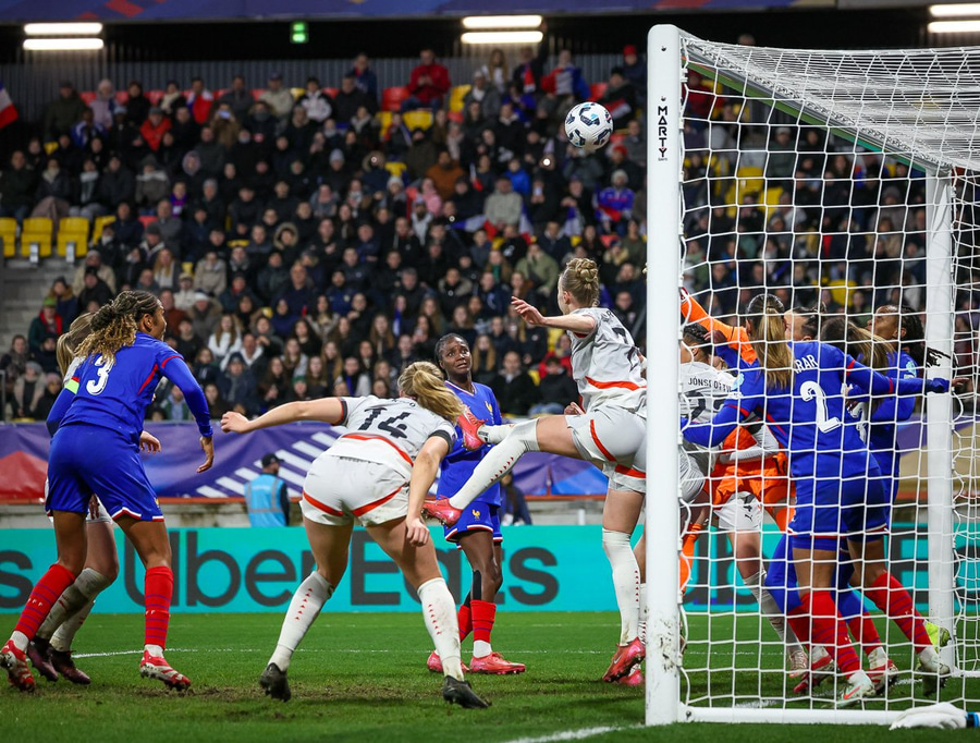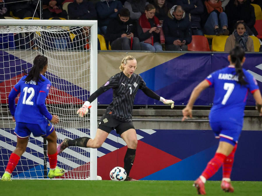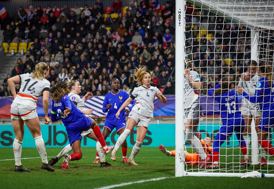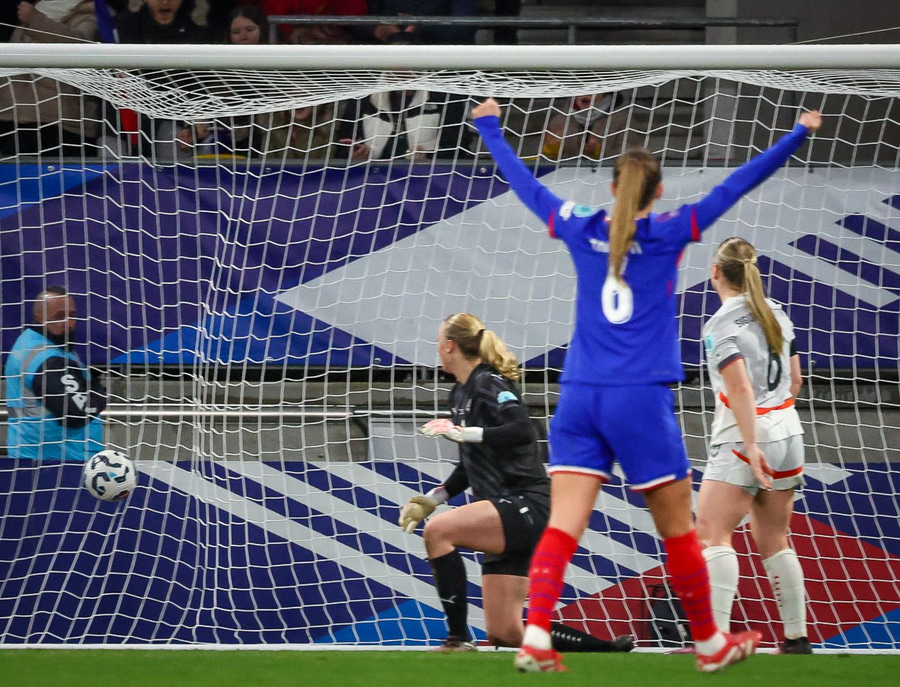 MARK!Aftur er munurinn bara eitt mark en franska liðið er allt annað en sátt. Þær hópast saman í kringum Alinu Pesu dómara leiksins. Vildu fá brot á Peyraud-Magnin.