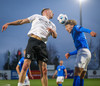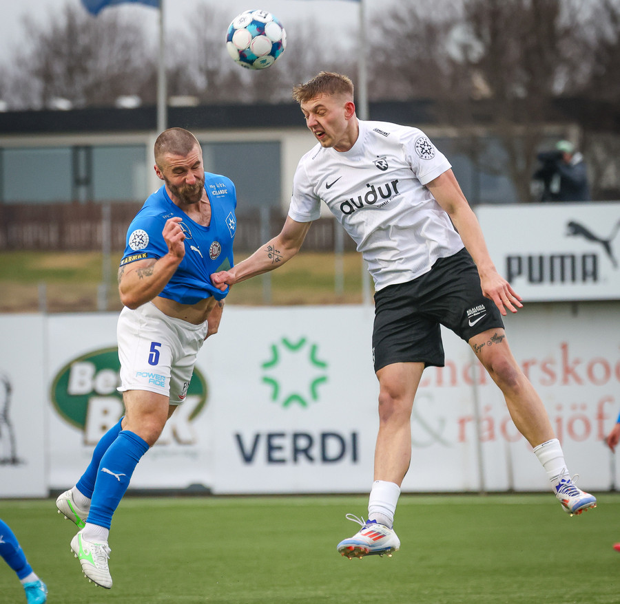 Benedikt Warén tekur aukspyrnuna og lyftir boltanum inn á teiginn á Örvar Eggertsson sem nær skallanum í átt að marki.