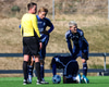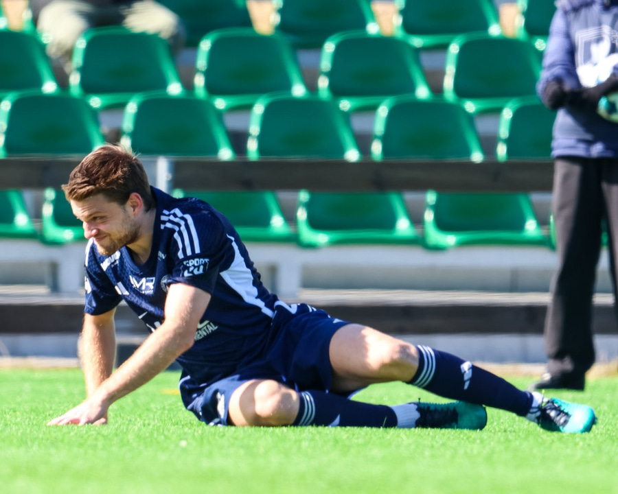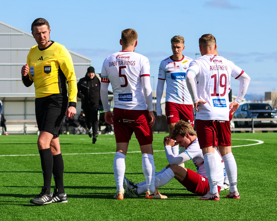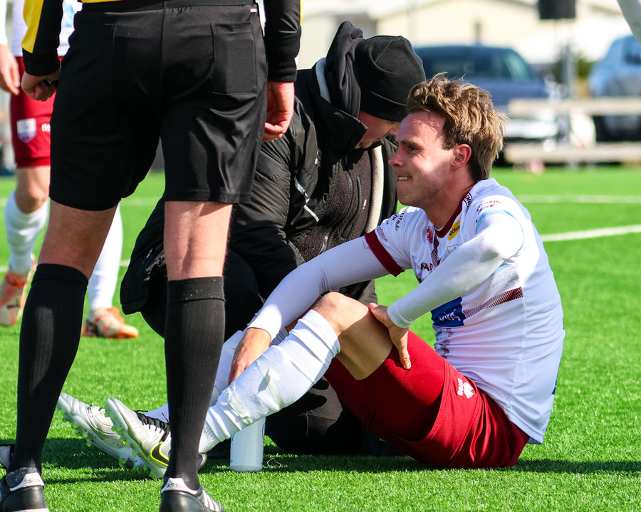 Arnór Daði Aðalsteinsson meiðist og þarf aðhlynningu. Leiknismenn þurfa að gera skiptingu.