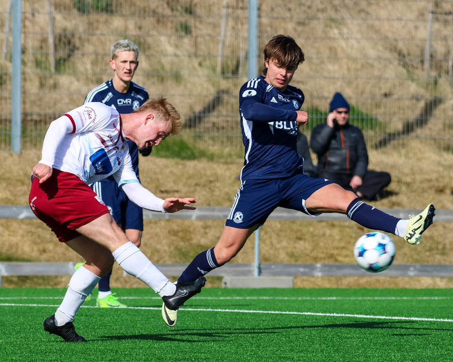 Kári Sigfússon með skot fyrir utan teig en beint á Bjarka Arnaldarson í marki Leiknis.