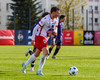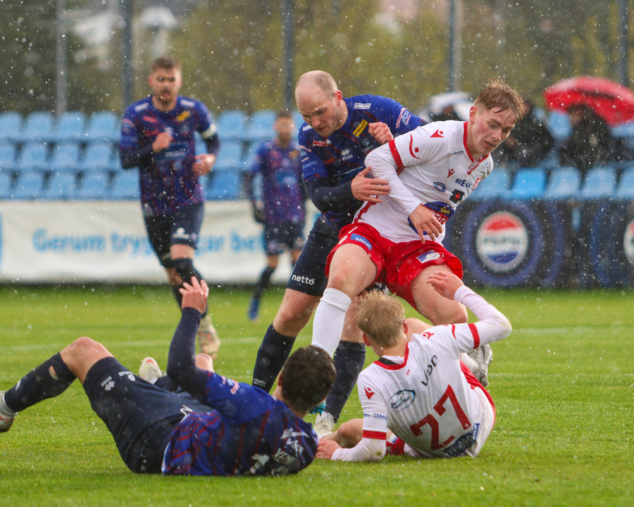 Það er skyndilega brjálað veður. Heeeellirigning og vitlysa. Þórsarar sækja með vindinum í átt að Hólabrekkuskóla í fyrri hálfleik.
