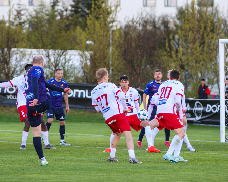 Leiknismenn sækja nokkuð stíft þessar mínútur og fá hverja hornspyrnuna á fætur annarri.