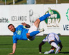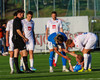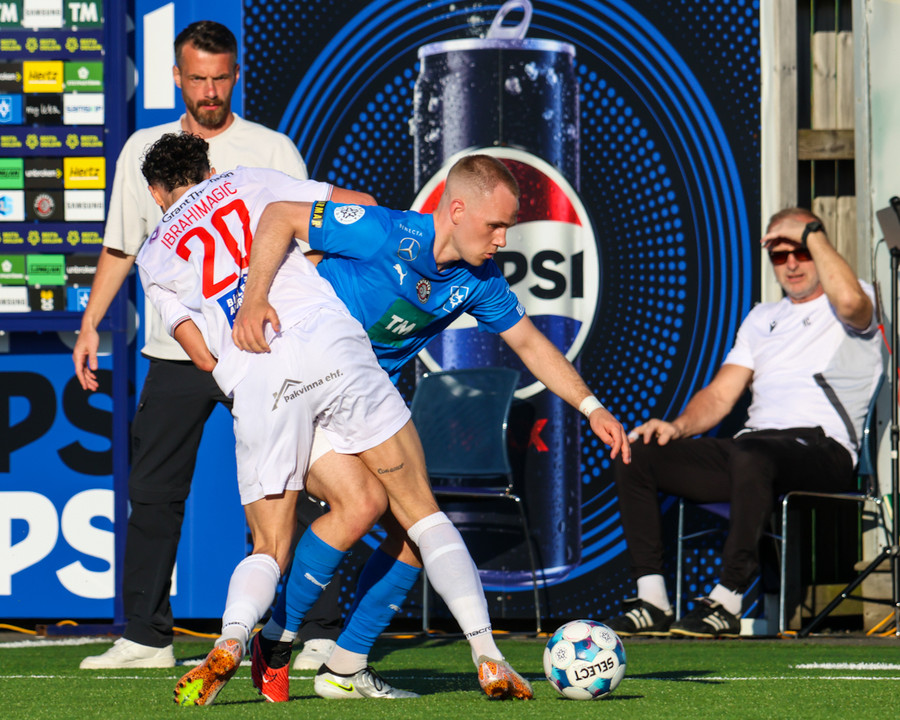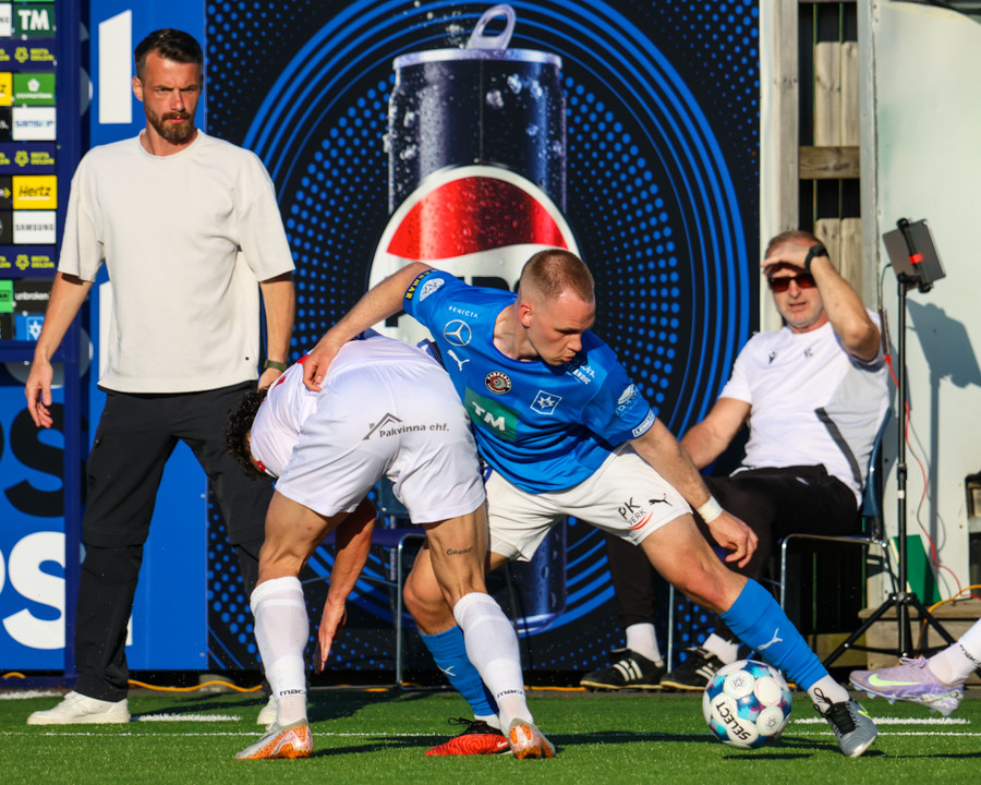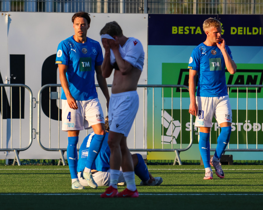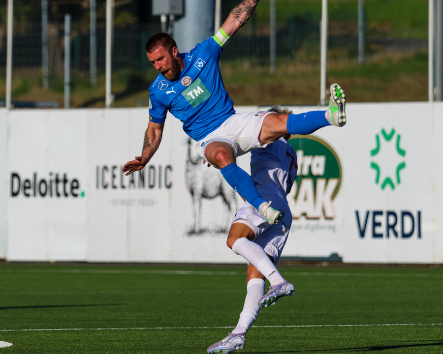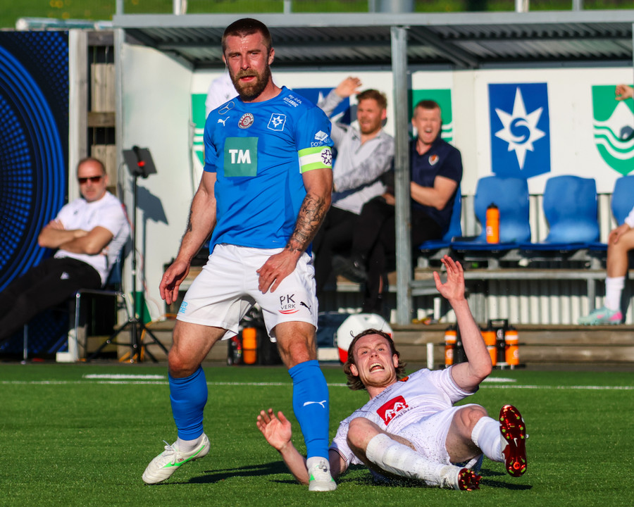 Daníel Finns fær aðhlynningu eftir að Gunnar Vatnhamar neglir boltanum í andlitið á honum. Tarik lætur Daníel heyra það í kjölfarið, óþarfi.