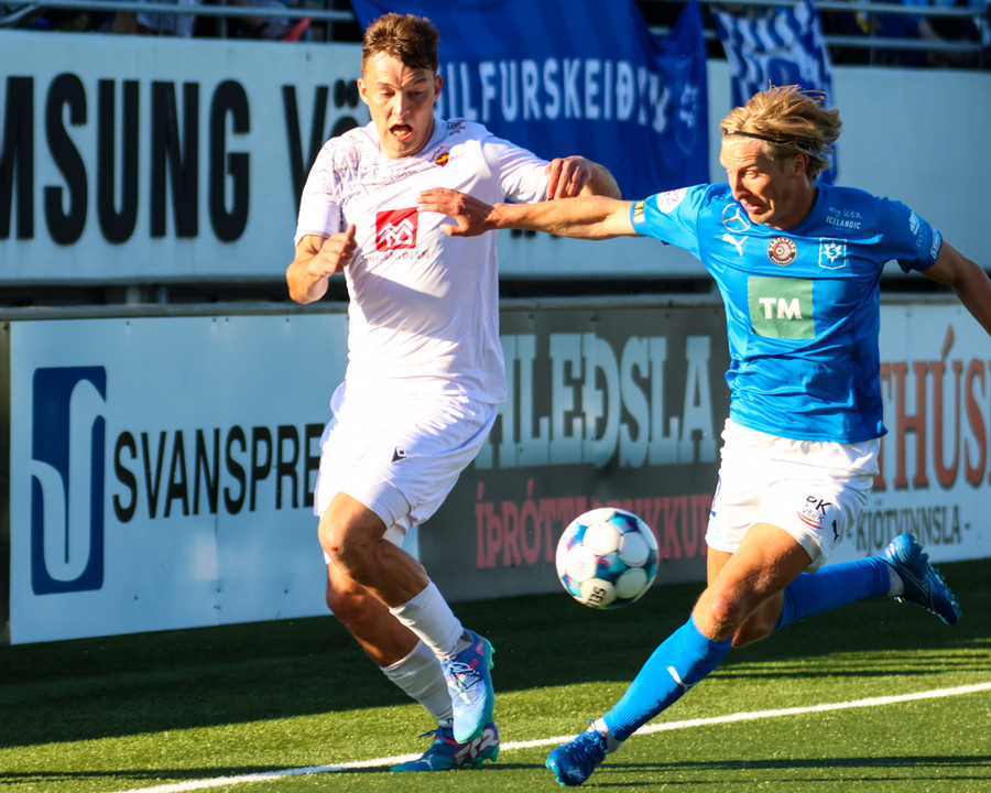 Gylfi gefur frábæra sendingu í gegn á Valdimar Þór en Guðmundur Kristjánsson nær að elta hann uppi.