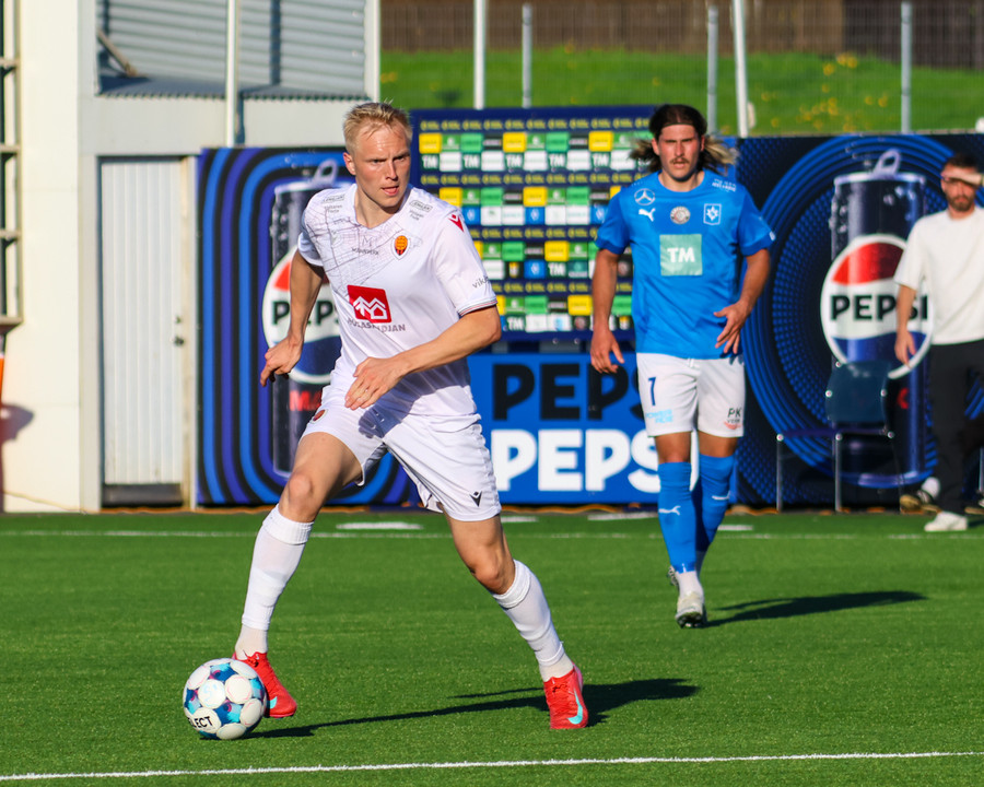 Árni Snær í alls kyns basli og sendir boltann einfaldlega beint í lappir Daníels Hafsteinssonar, sem nær ekki krafti í skotið.