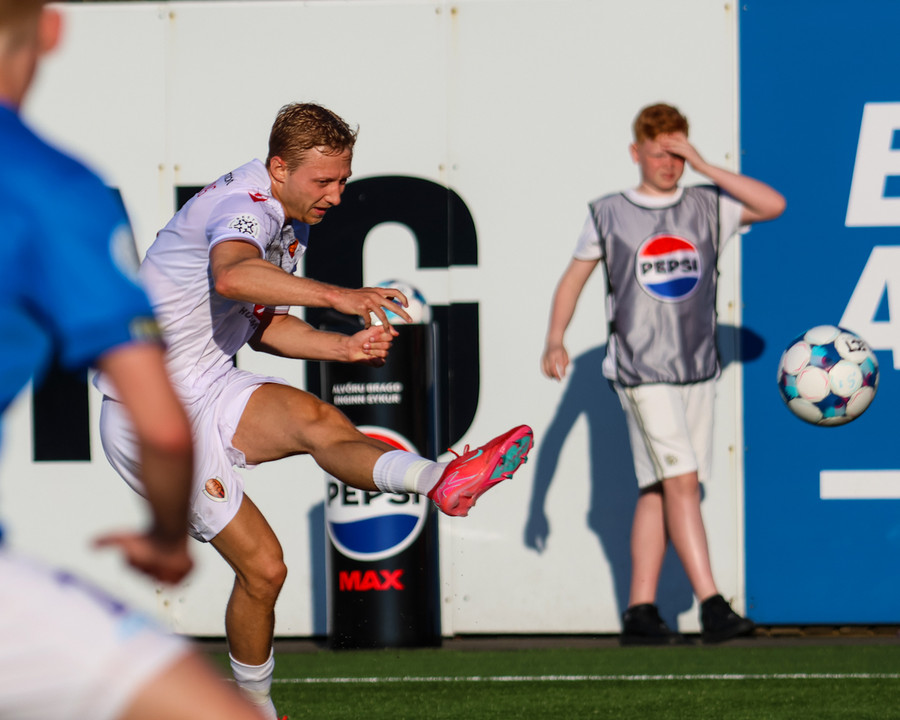 Boltinn dettur fyrir Erling Agnarsson inn í teig en hann skýtur fram hjá markinu.
