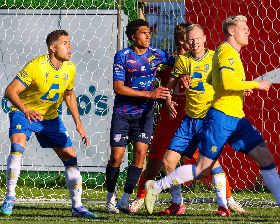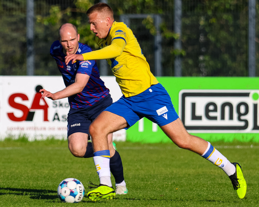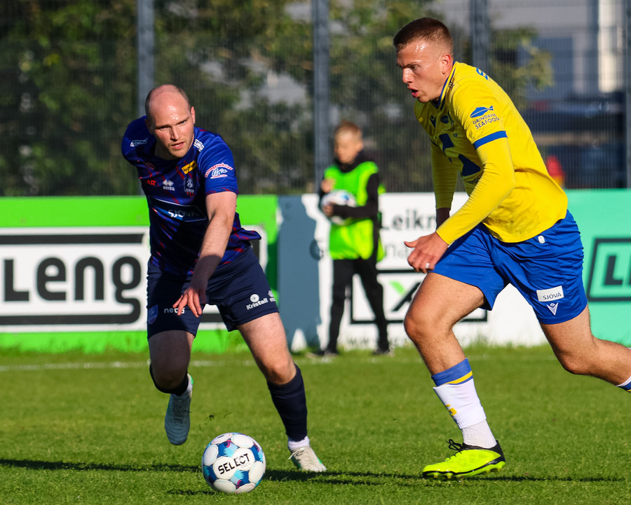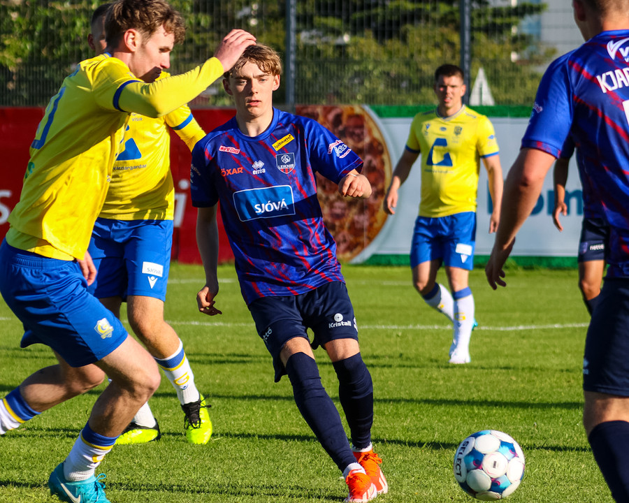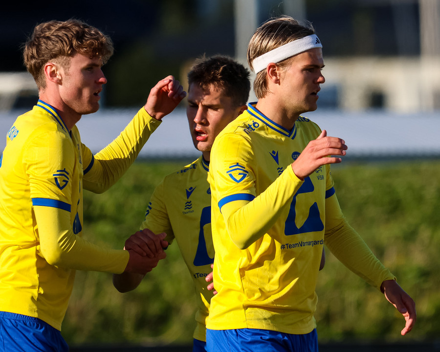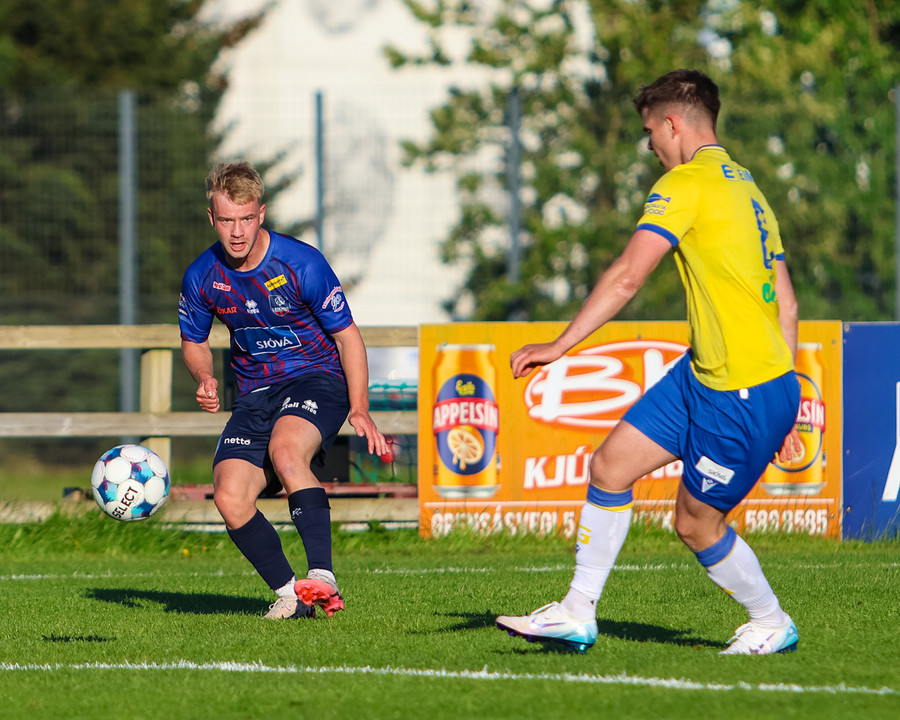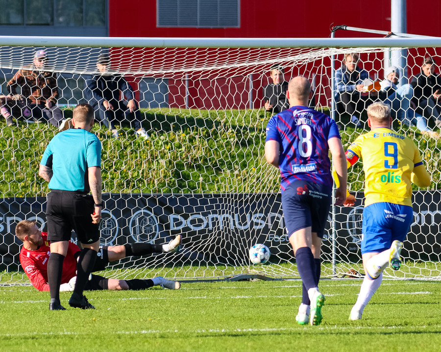 Kári Steinn fer í baráttu við Eystein. Kári nær að vinna boltaann og leggur boltann á Shkelzen sem hamrar boltann í netið.
