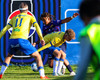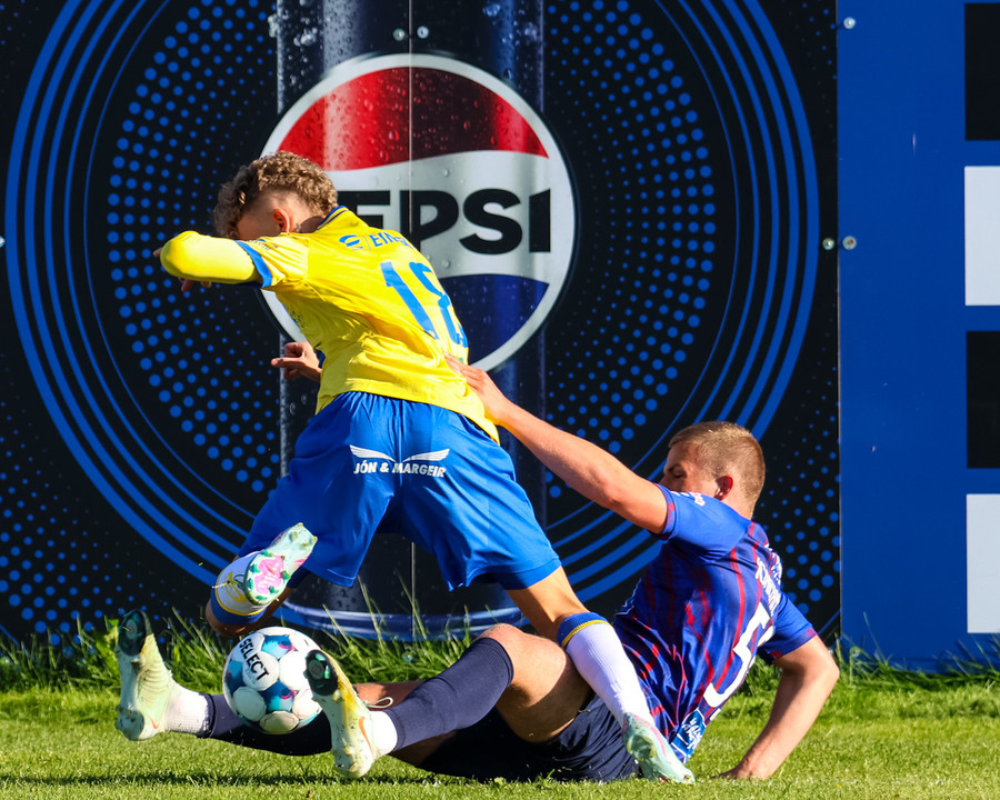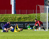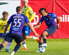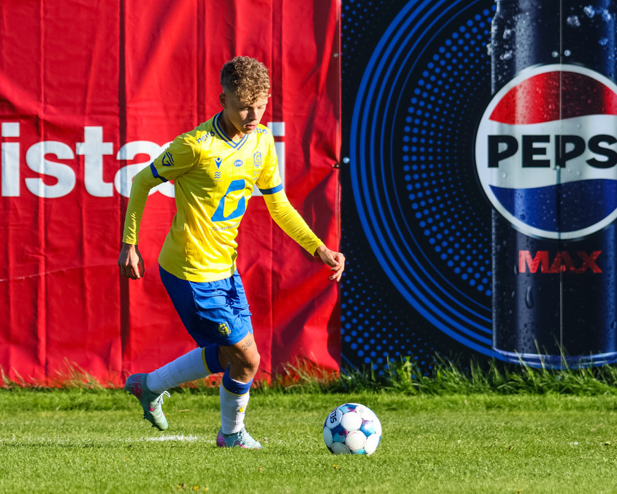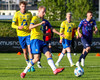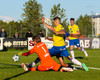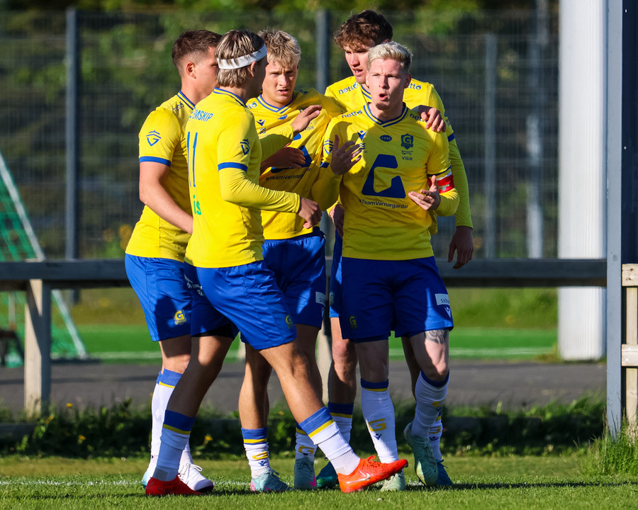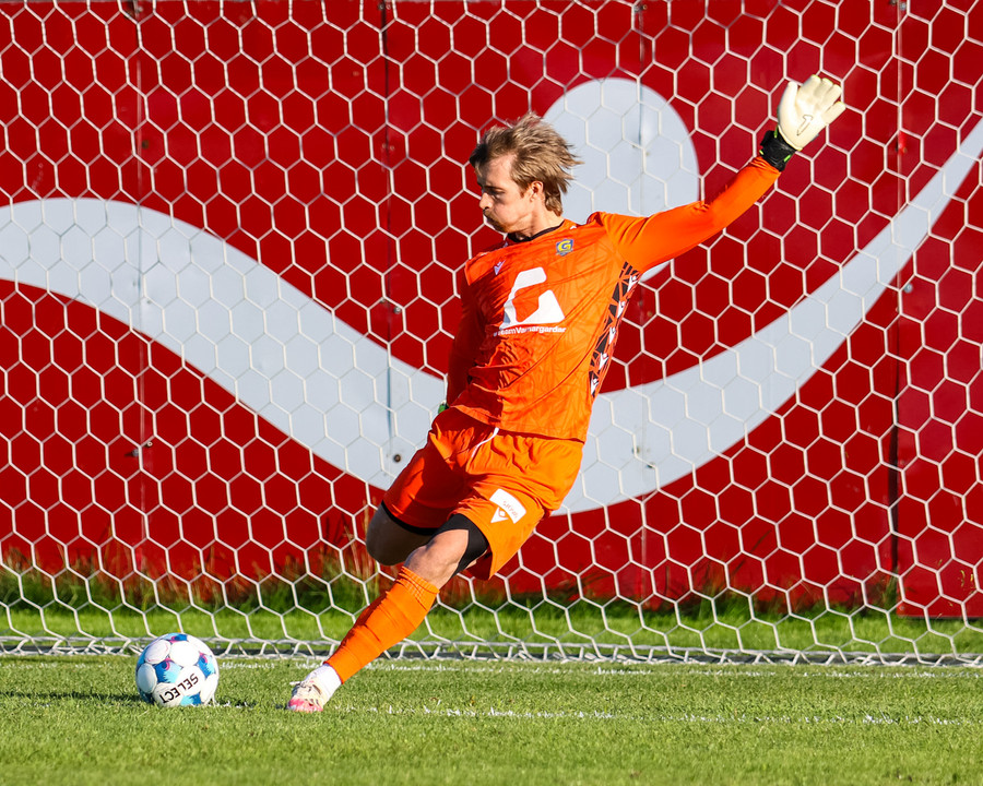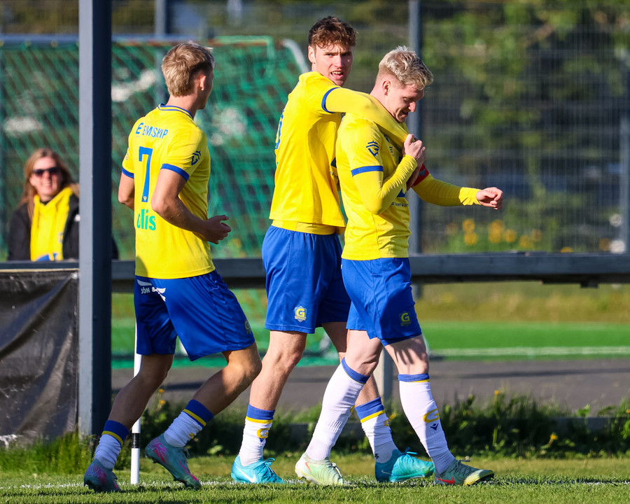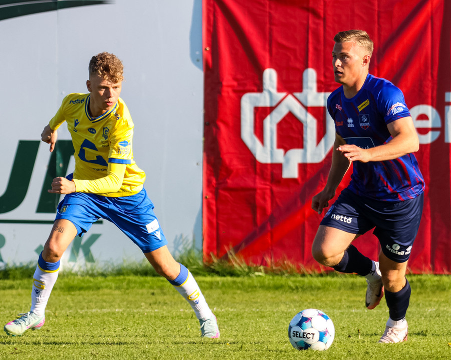 Kári Steinn fer í baráttu við Eystein. Kári nær að vinna boltaann og leggur boltann á Shkelzen sem hamrar boltann í netið.