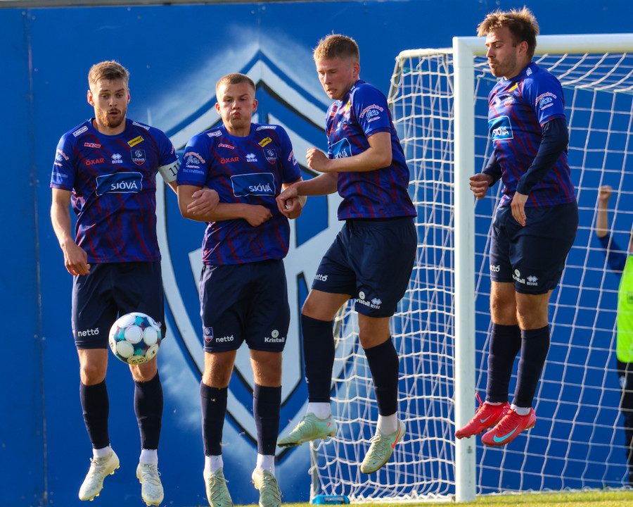 Emil Nói tekur aukaspyrnuna en hún fer beint í vegginn! Væntanlega pirraður að hafa ekki náð að reyna á Óla Íshólm þarna.