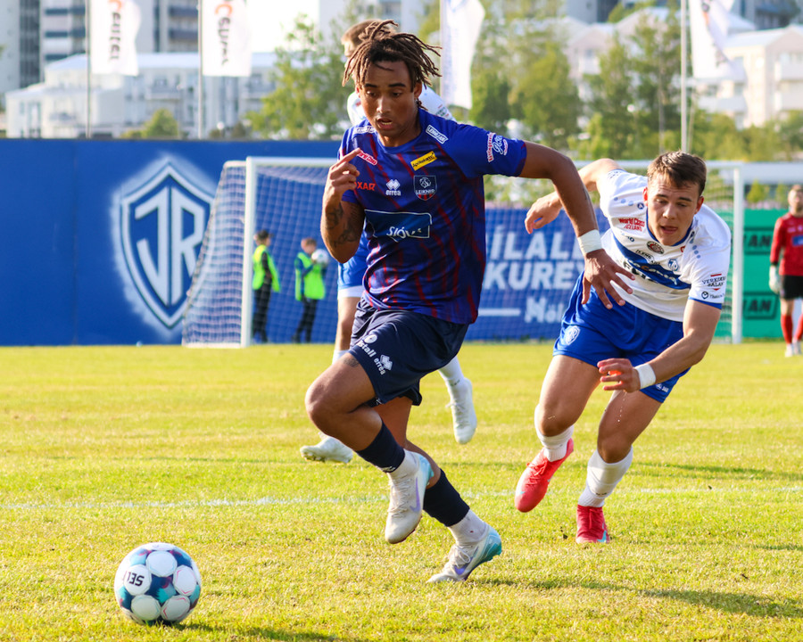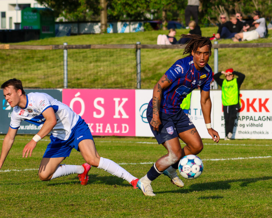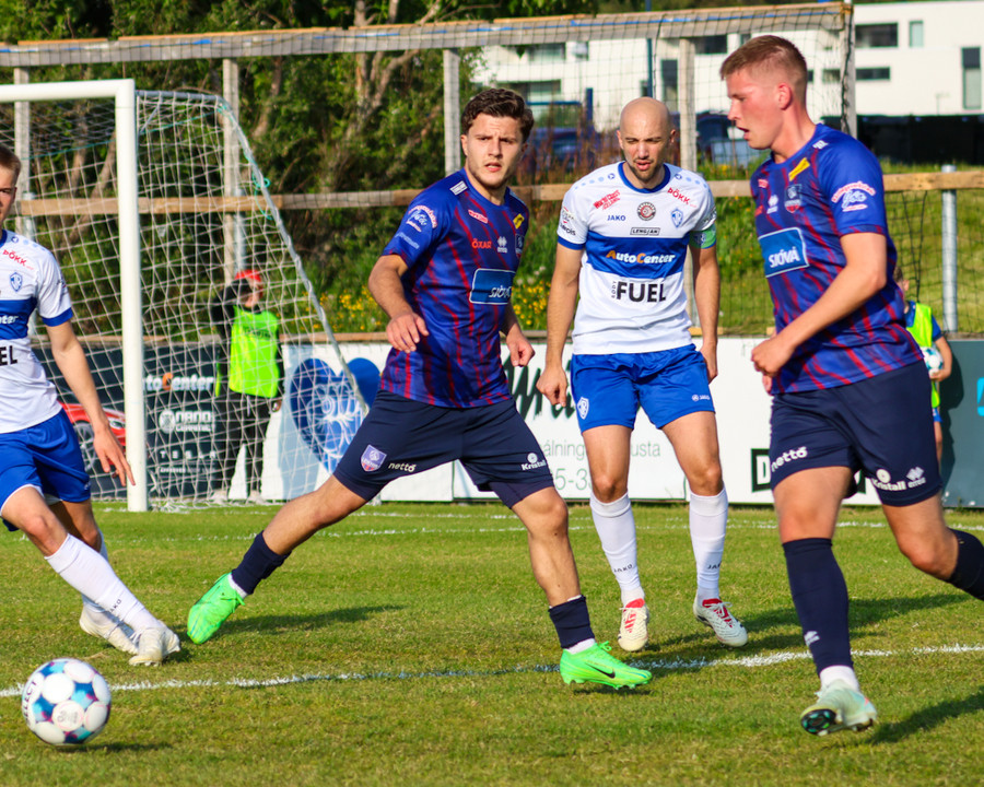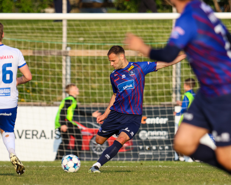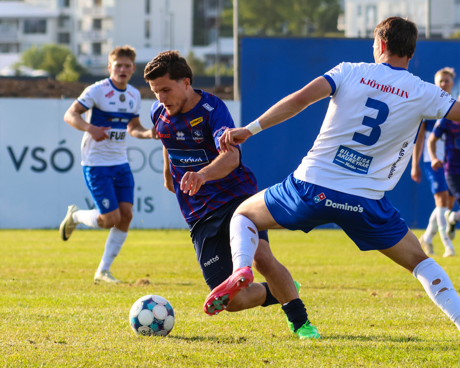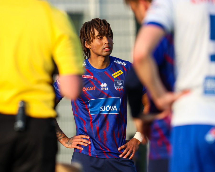 Leiknir fær aukaspyrnu ekki svo langt frá teignum. Shkelzen gerir sig kláran í að gefa fyrir eða skjóta. Hann er alveg líklegur til að skjóta.