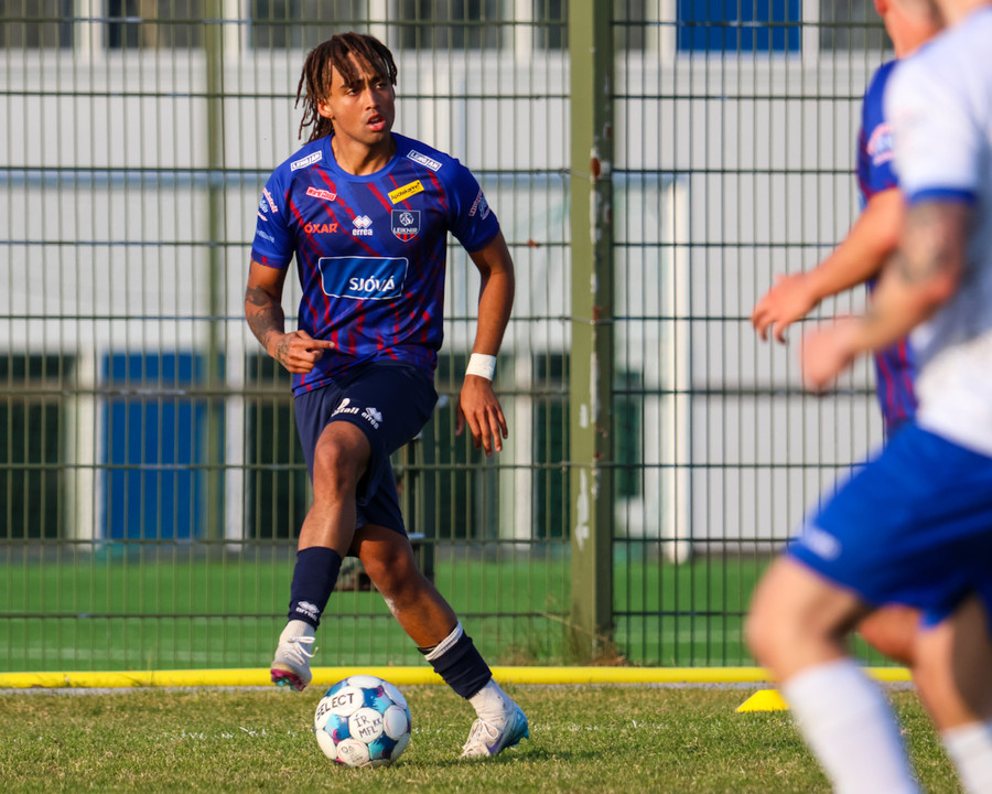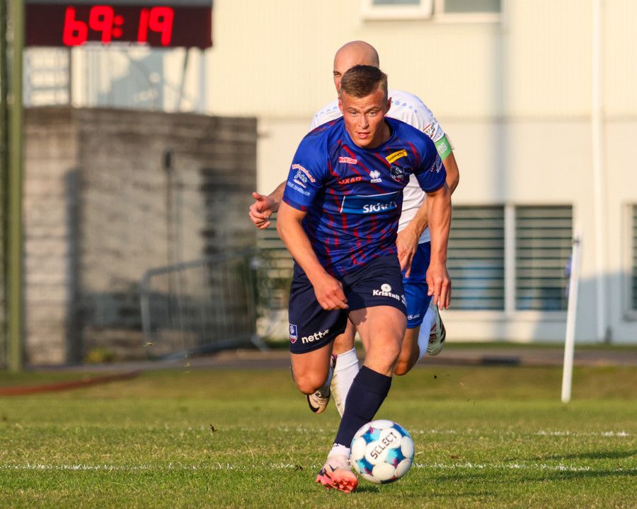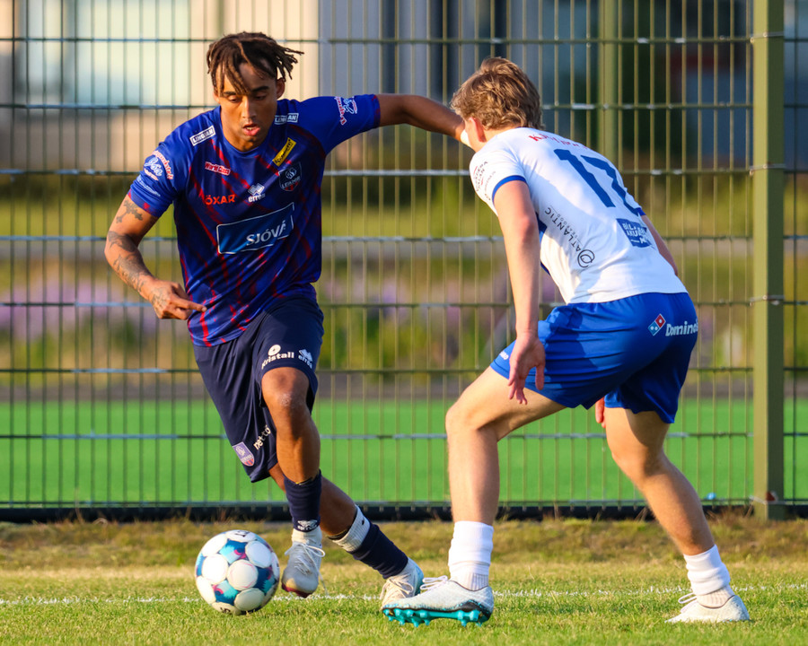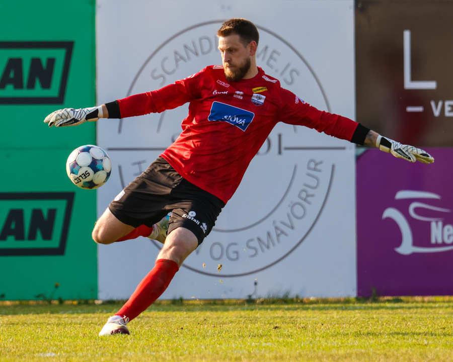 Þorsteinn Emil tekur skot fyrir utan teig sem fer af varnarmanni og ratar á markið, en Vilhelm er vel á tánum og nær að verja.