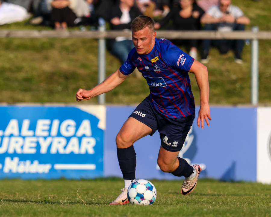 Óðinn með góðan bolta upp í hornið á Ágúst Unnar og hann reynir sendingu fyrir markið. Víðir er að koma á fjærstöngina en sendingin er aðeins of föst.