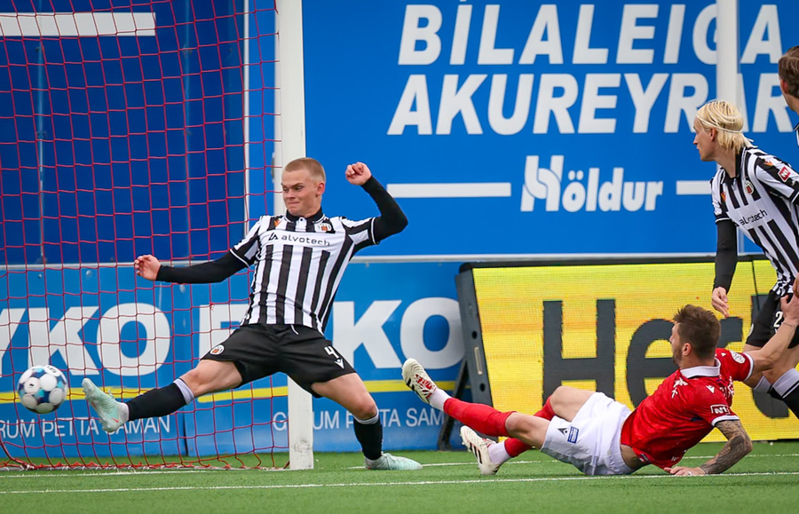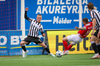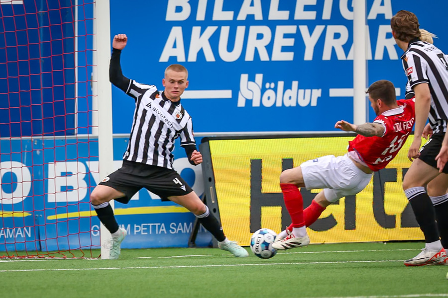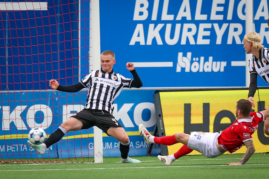 Sigurður Egill fer í tæklingu inni í teig og rennur örugglega lengra en hann ætlaði sér, og fer utan í Jóhannes Kristinn sem fer niður og er á leiðinni á punktinn!