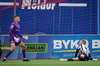 Jakob Franz vinnur boltann af Finni Tómasi ofarlega á vellinum og reynir skotið strax sem Halldór ver nokkuð örugglega.