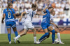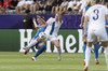 Guðný Árnadóttir geysist upp hægri vænginn. Með tíma og pláss reynir hún fyrirgjöf en Finnar bjarga.