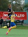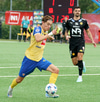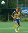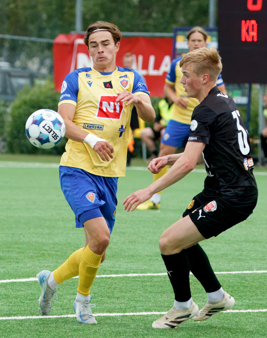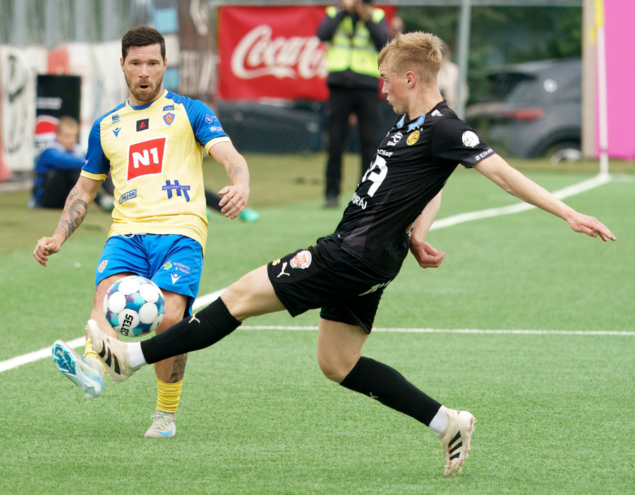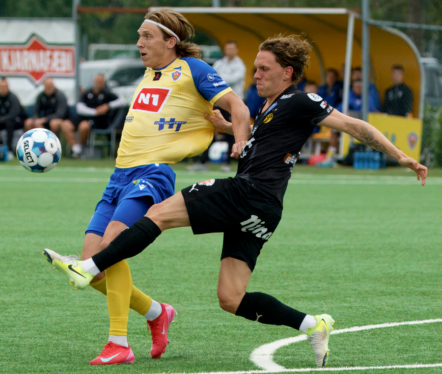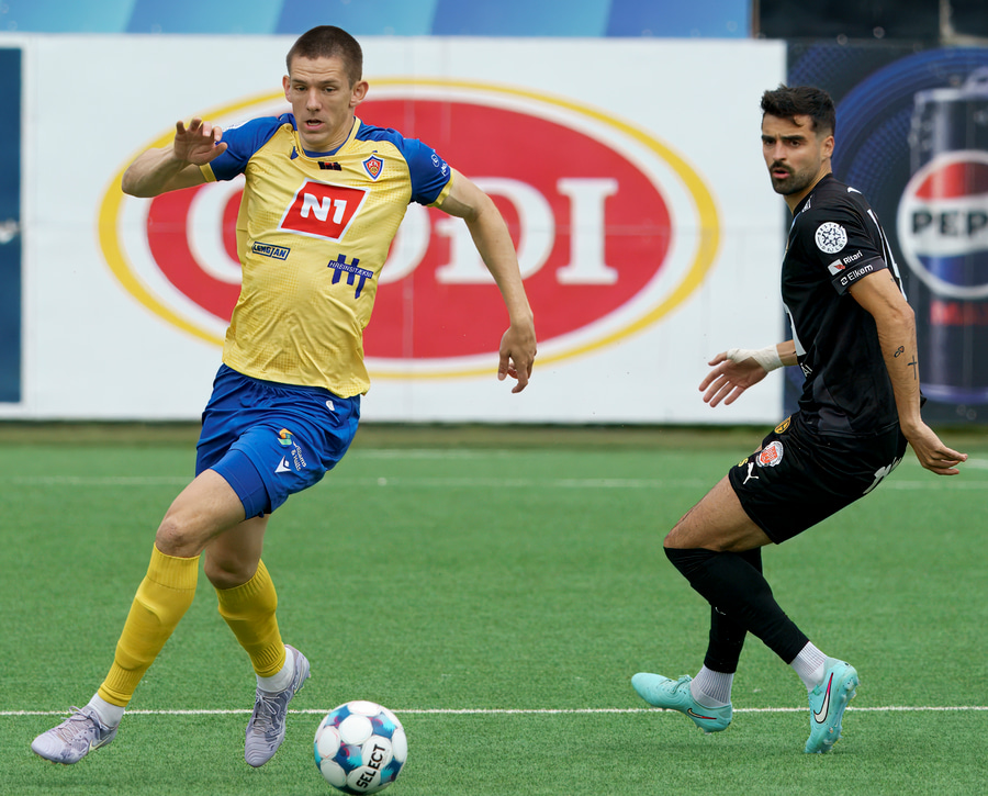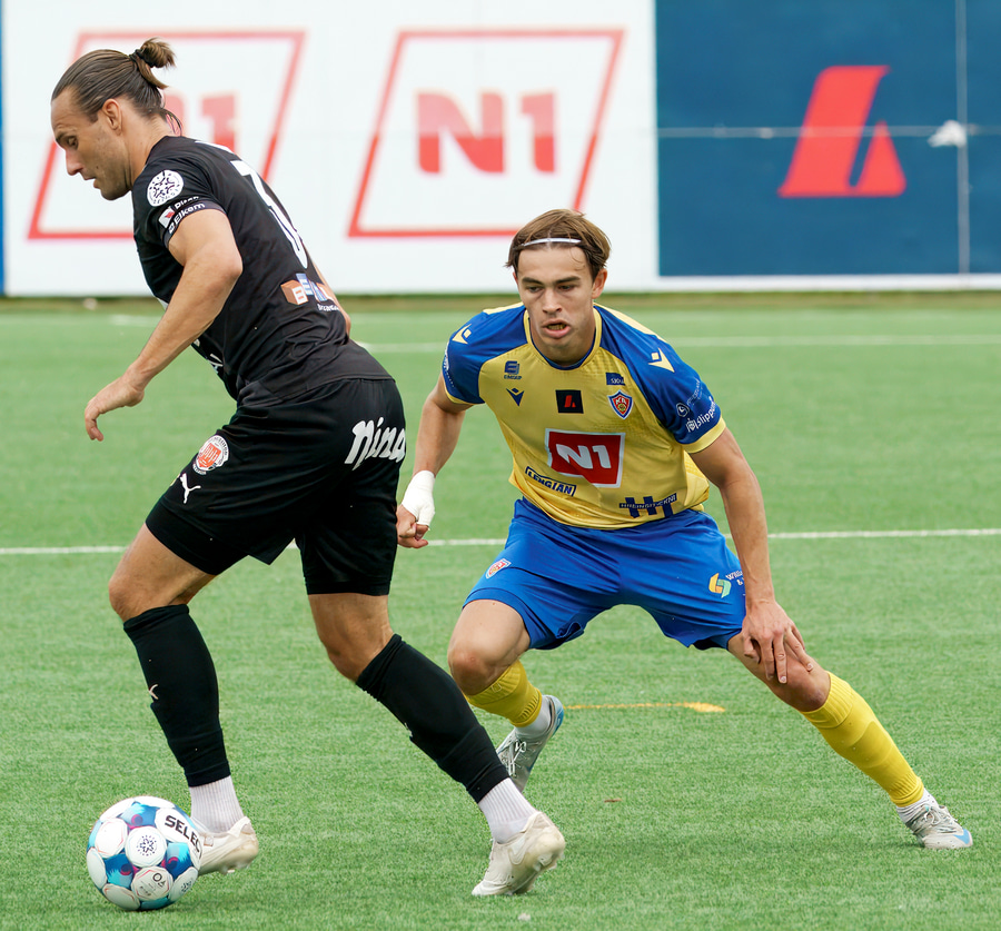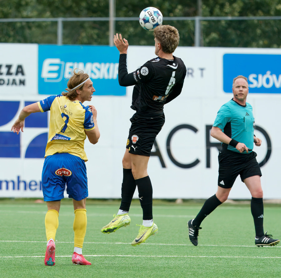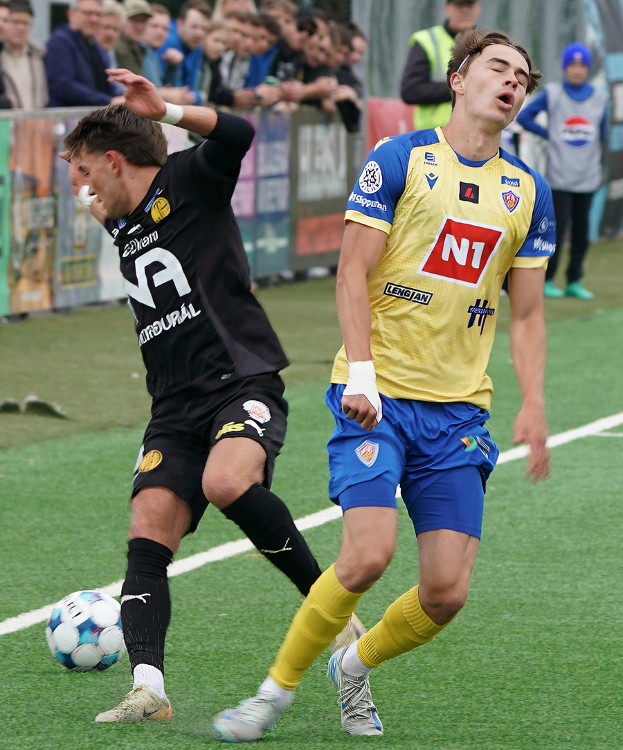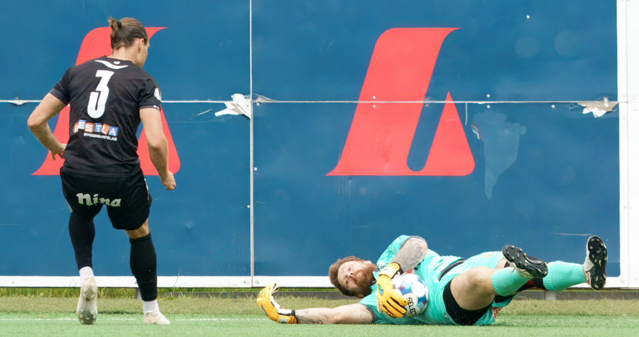 Marcel Römer kemur boltanum á Grímsa sem á frábæra stungusendingu á Ingimar Stöle. Hann leggur boltann fyrir og Jóan tæklar boltann í opið markið.