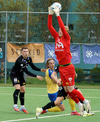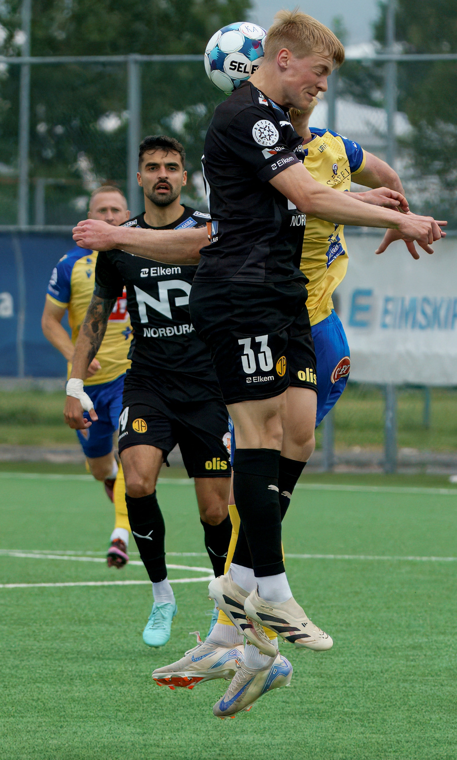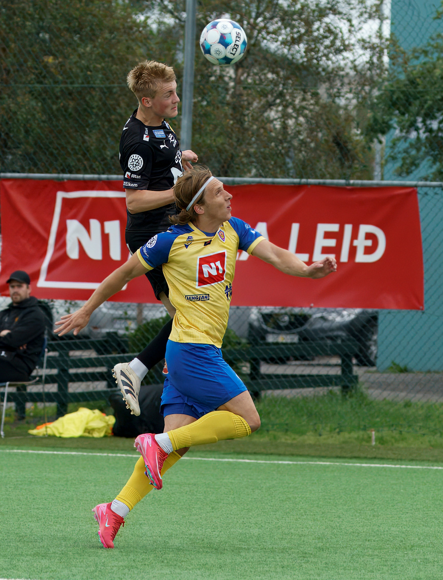 Viktor Jónsson og Stubbur fara upp í boltann og Stubbur kveinkar sér aðeins en er búinn að ná sér fljótt.