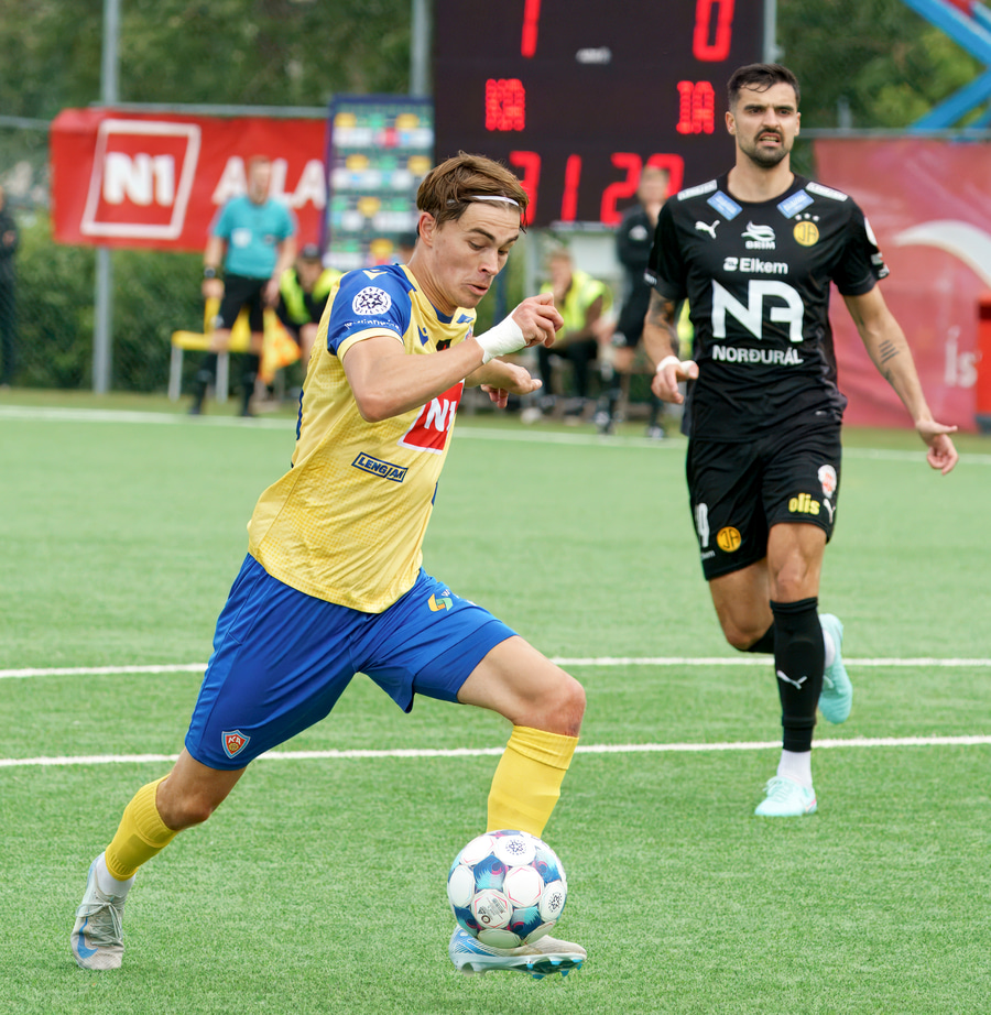 Ómar Björn Stefánsson með magnaðan sprett inn á teiginn. Stendur allt af sér en boltinn endar síðan í varnarmanni og horn.