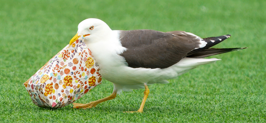 Mávur flaug inn á völlinn með nammipoka þegar Stubbur var að jafna sig. Vakti lukku í stúkunni og fleiri mávar komu í kjölfarið.