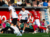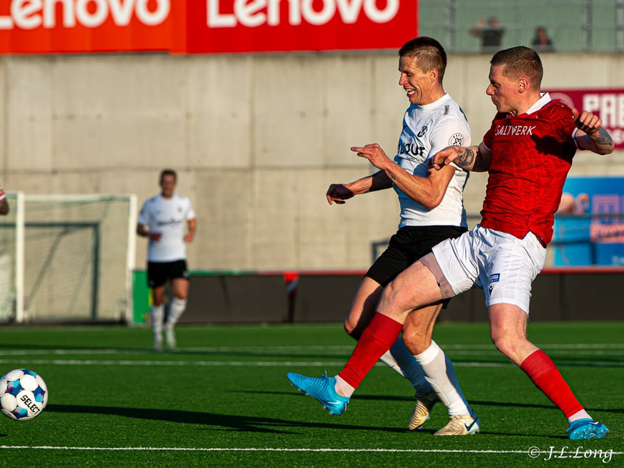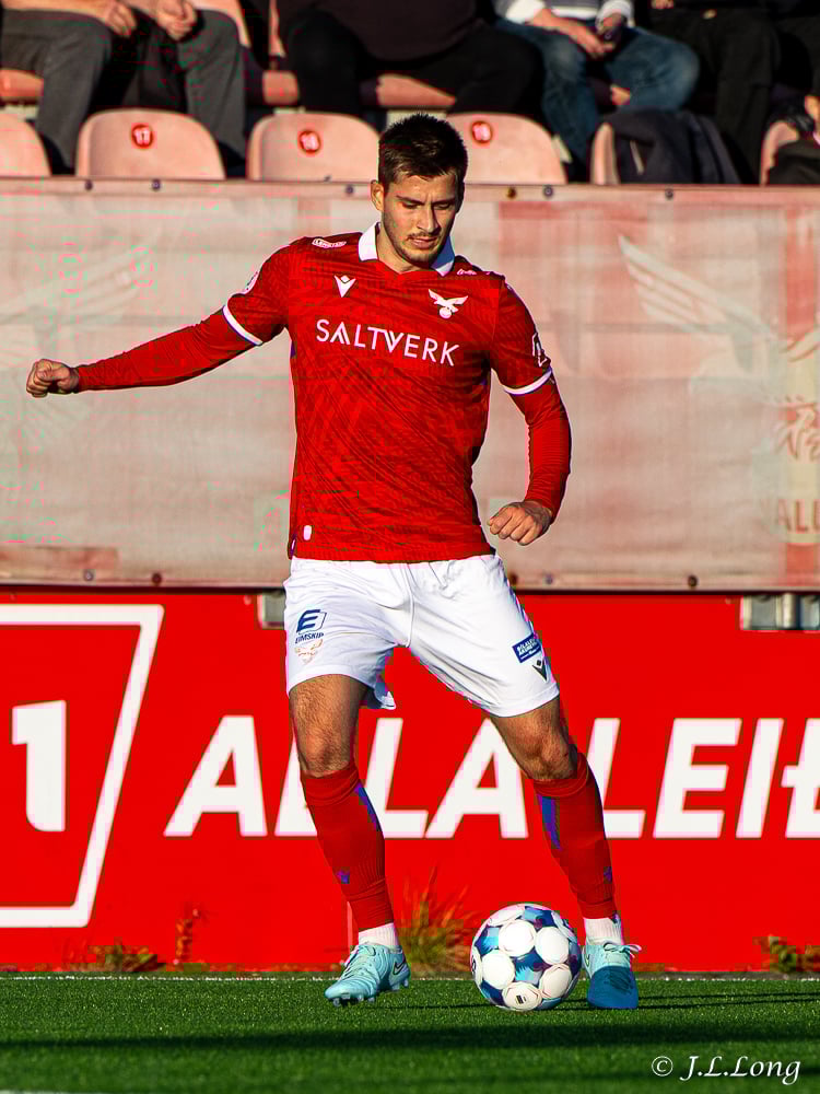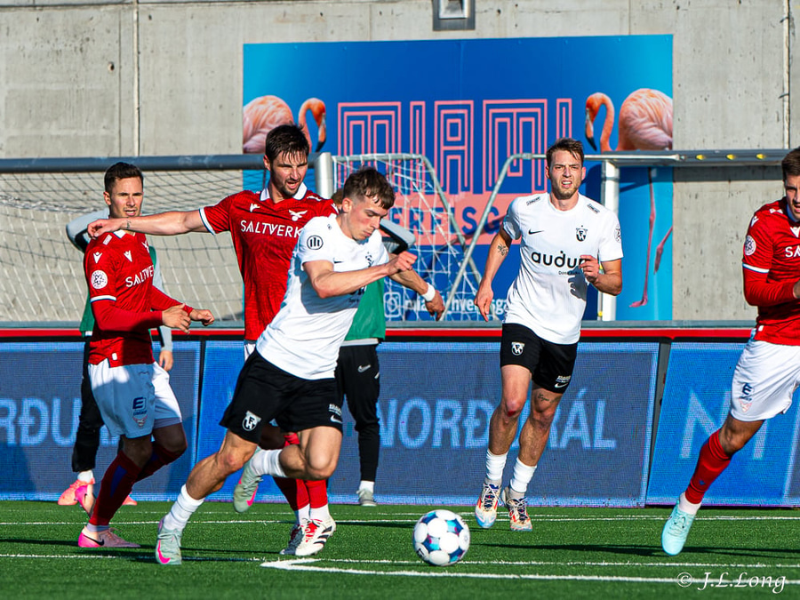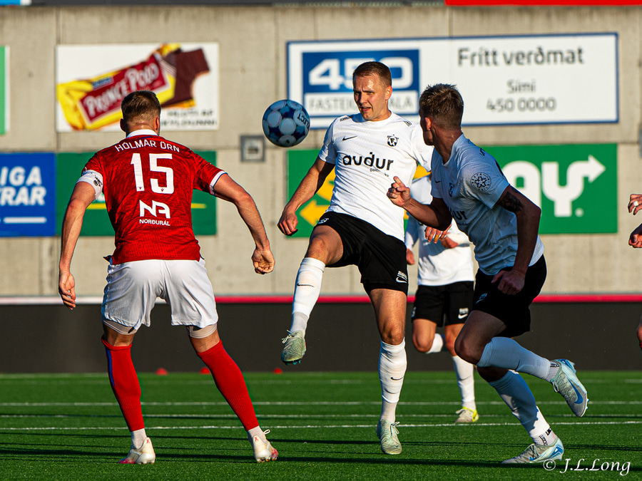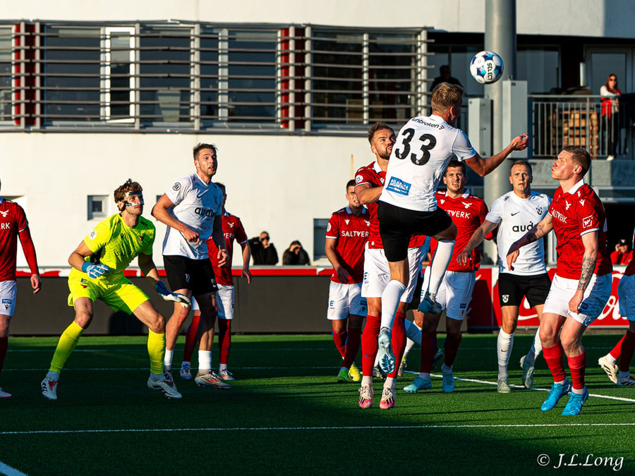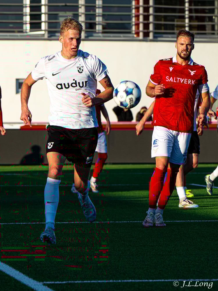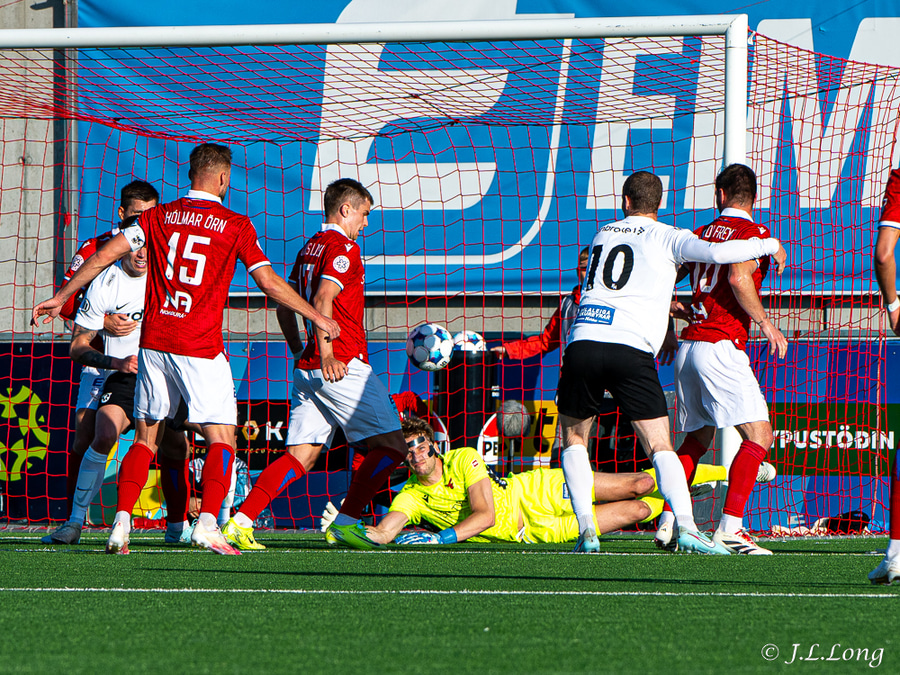 Úlfur með fastan bolta fyrir teig sem kemur aðeins fyrir aftan Sigurð Bjart. Hann reynir þá bara að setja hælinn í boltann en nær ekki að stýra boltanum í átt að marki.