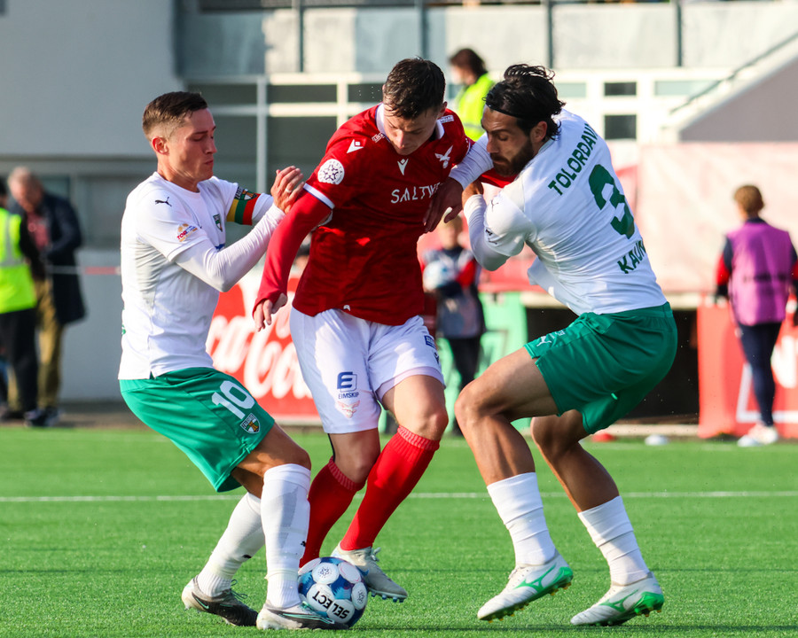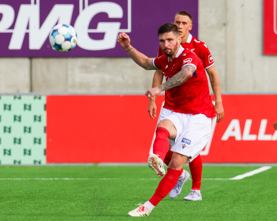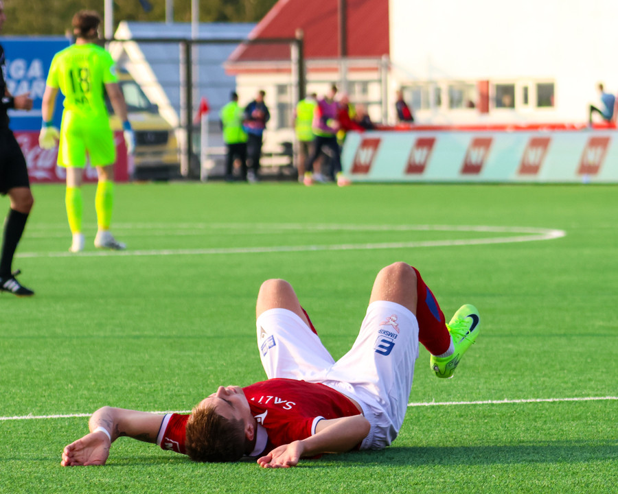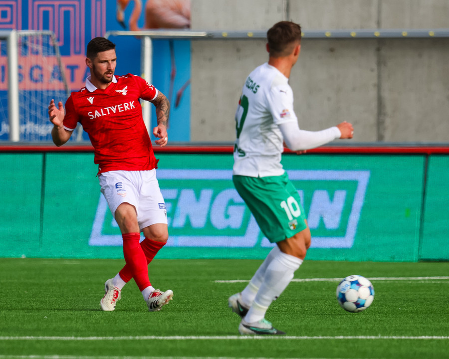 Nosa keyrir upp hægri kantinn og kemur með bolta fyrir á Amine sem tekur á móti boltanum í staðinn fyrir að skjóta í fyrsta. Hann missir boltann langt frá sér og það myndast mikið klafs inni á teignum. Að lokum er dæmt hendi á leikmann Zalgiris og Valsmenn geta andað léttar.