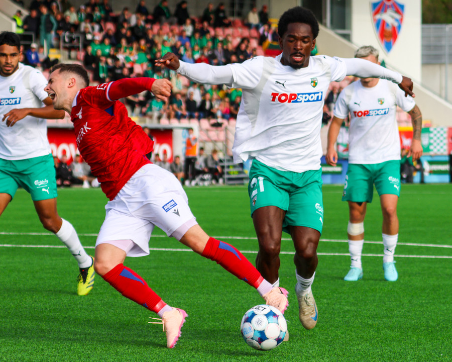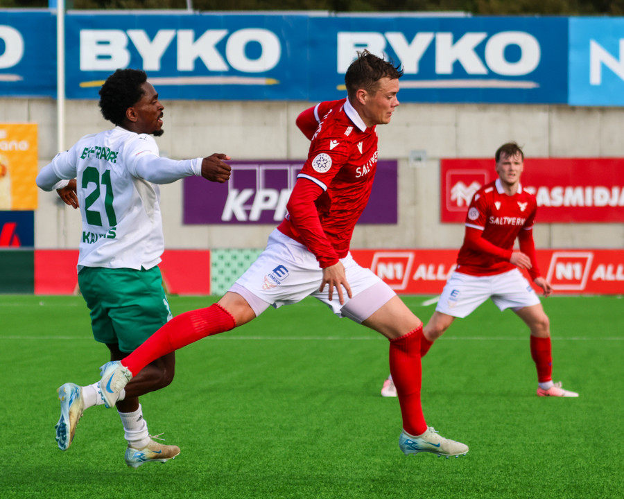 Enn og aftur er Temur að sleppa einn í gegn en núna nær Bjarni Mark að teygja sig í boltann á undan honum áður en Temur kemst einn á móti Frederik. Augnablikið er svo sannarlega með gestunum þessa stundina.