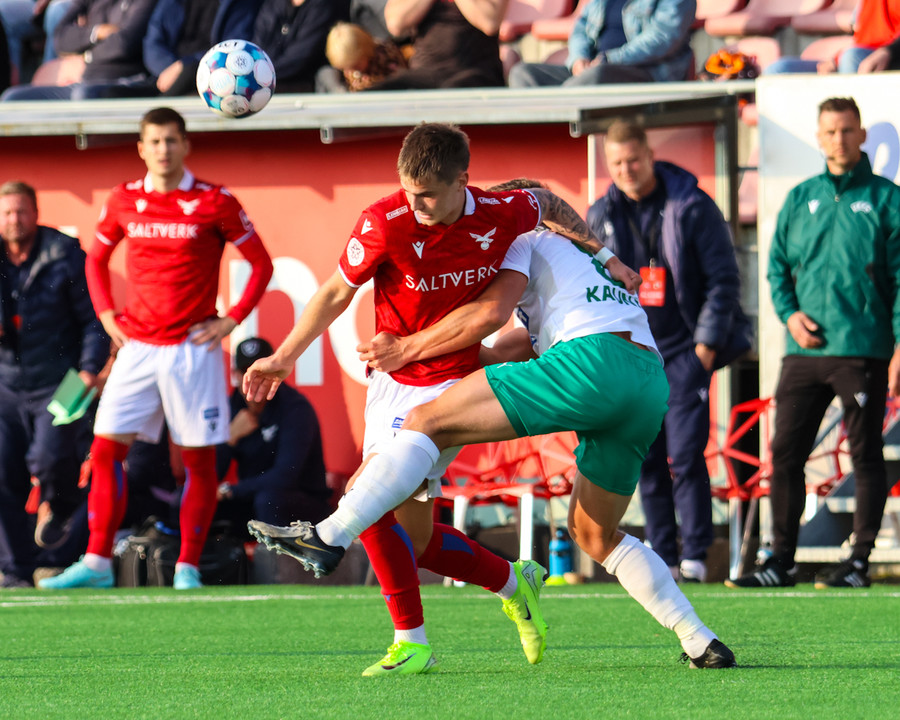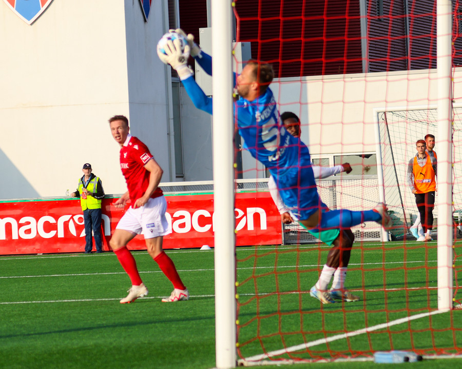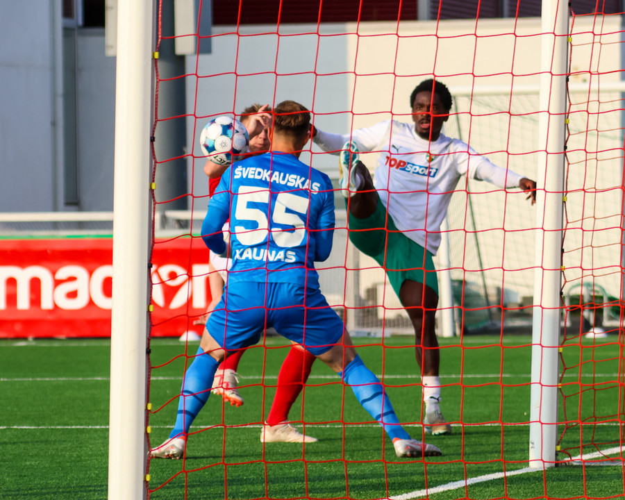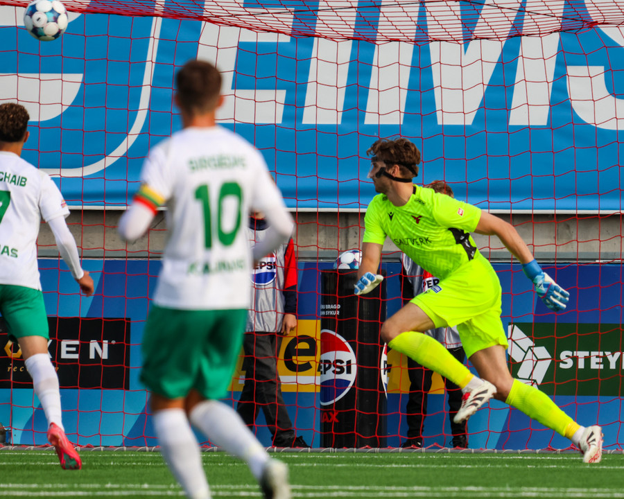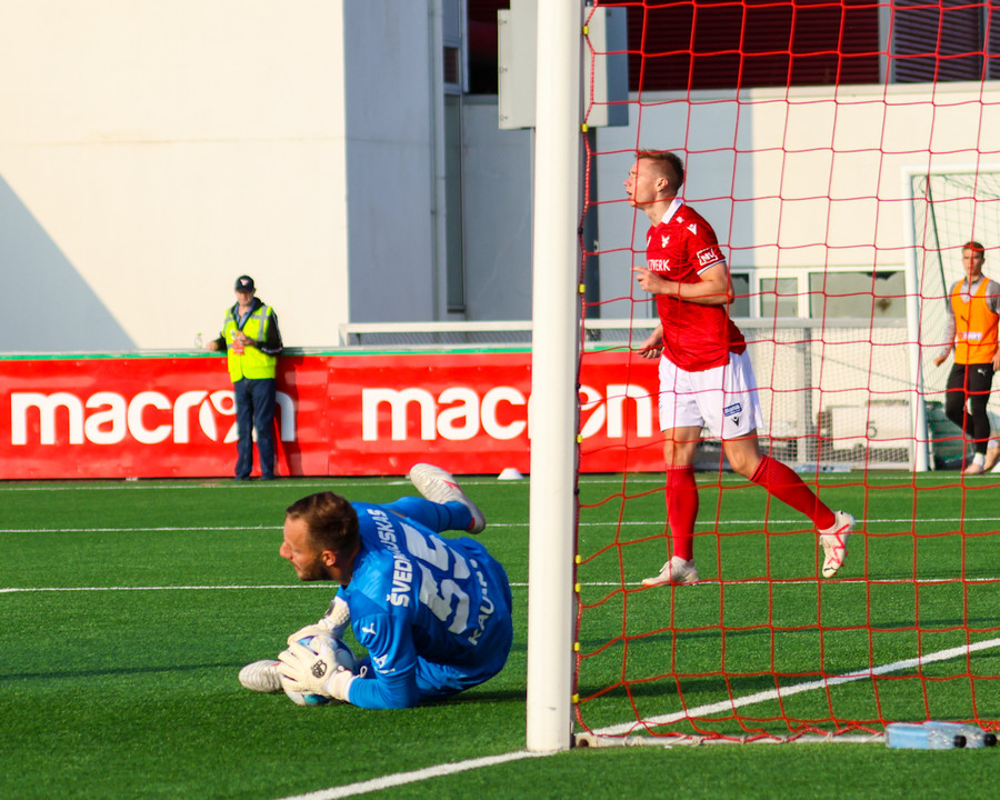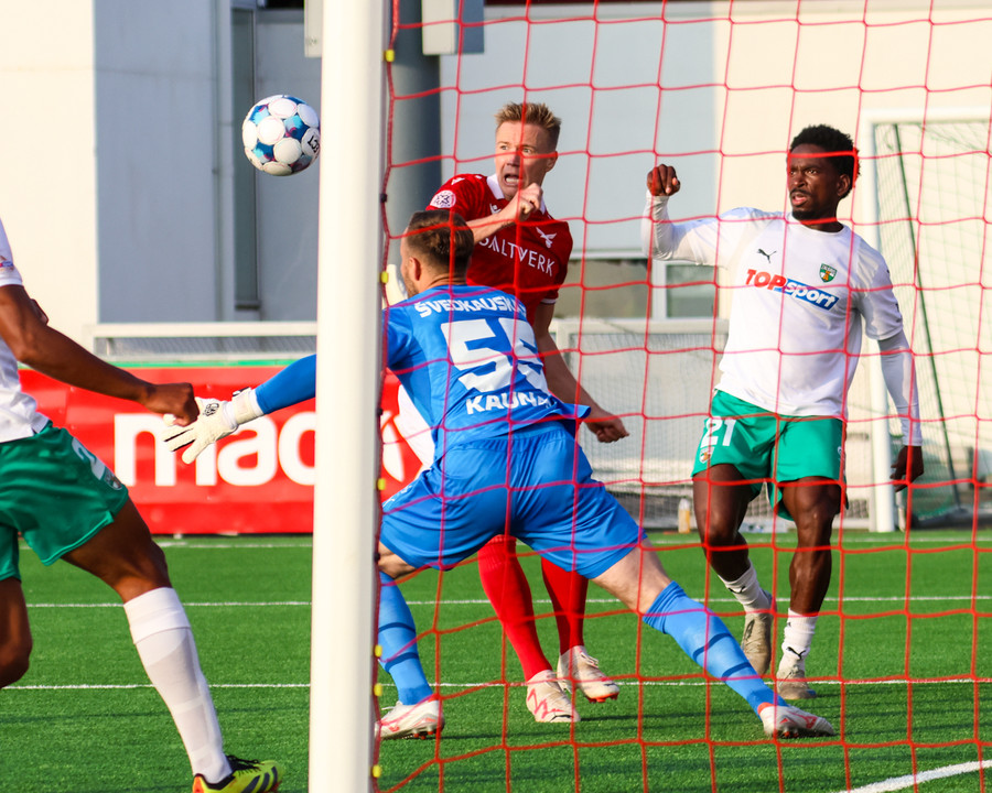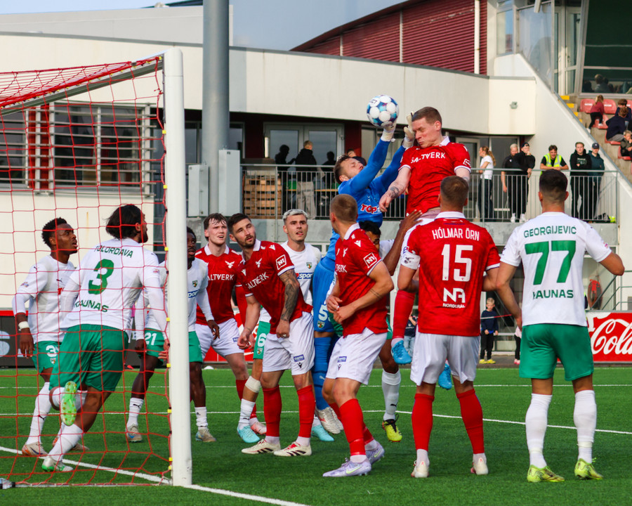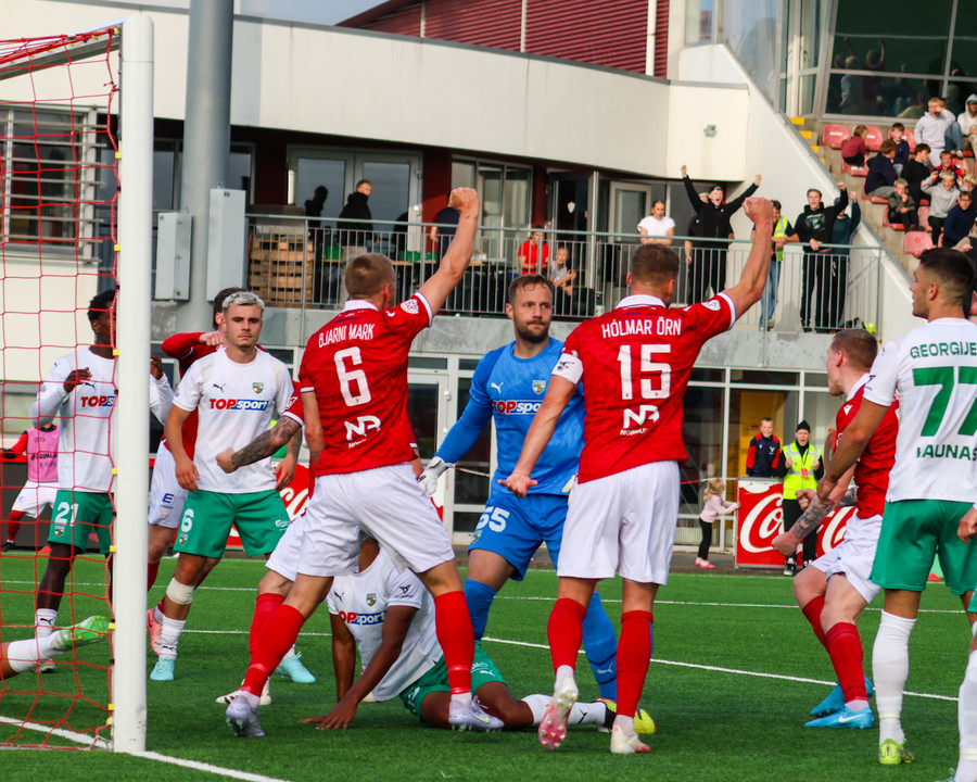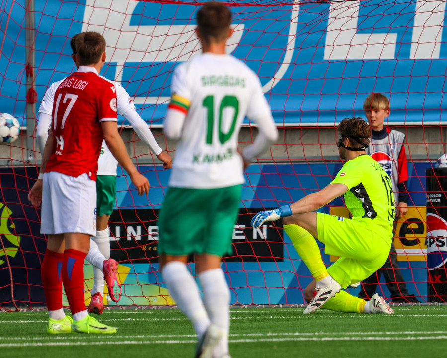 Tryggvi tekur spyrnuna inn á teiginn þegar það er meira en mínúta síðan uppgefinn uppbótartími var liðinn. Orri fær boltann á pönnuna og skallar boltann í netið. Varnarmaður Zalgiris reynir að bjarga á línu en sparkar boltanum í þaknetið í staðinn.