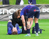 Adam Örn fer meiddur út af velli, virðist vera lærið