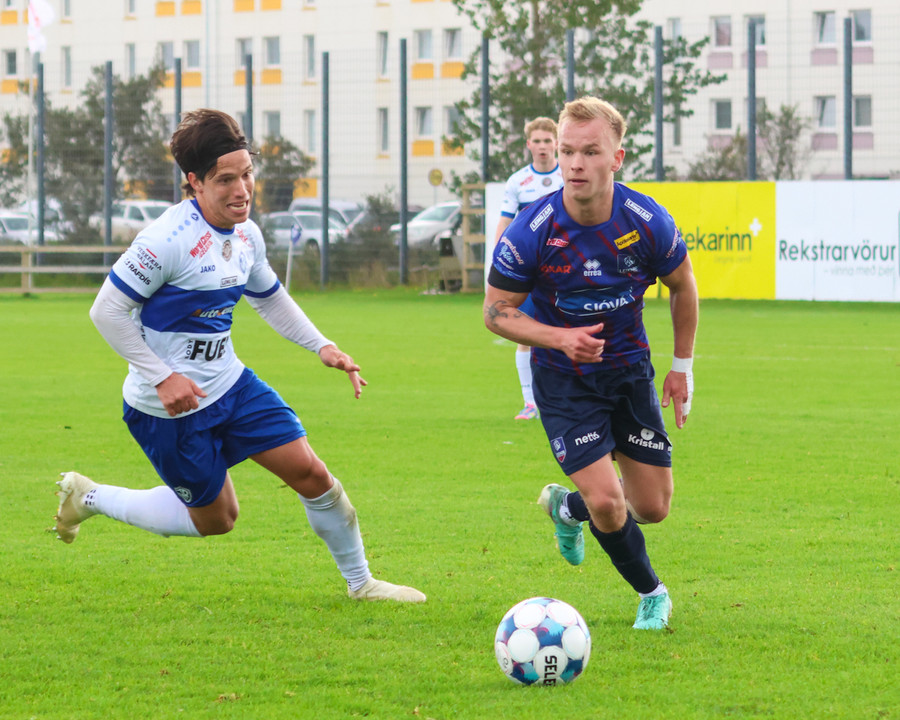 Aron Skúli sleppur í gegn á vinstri kantinum og reynir að senda á Veseli sem er hinum megin en sendingin aðeins of föst