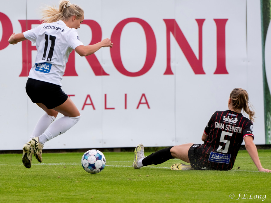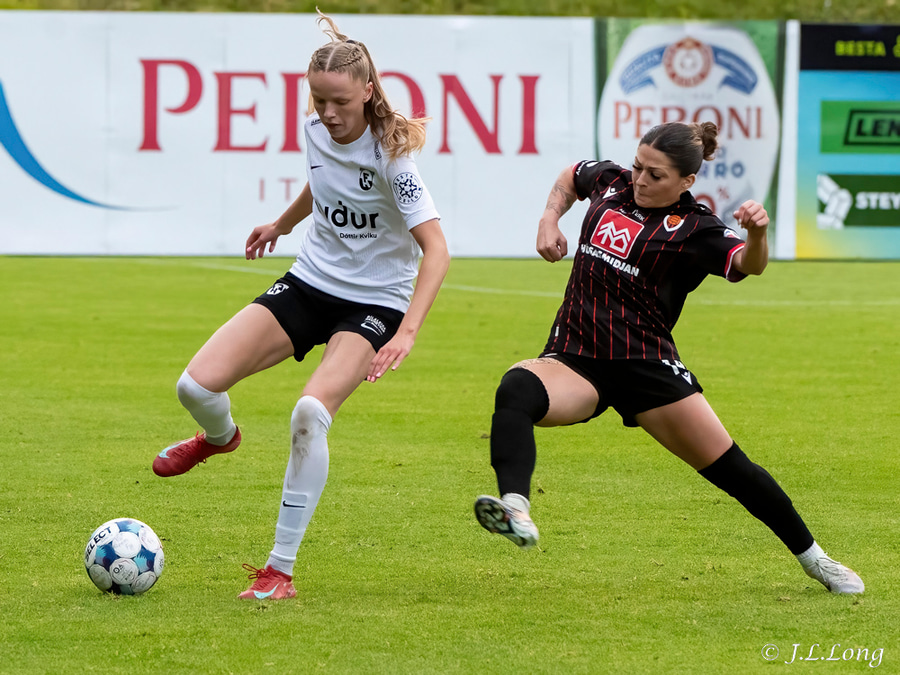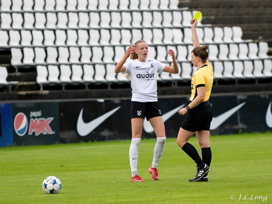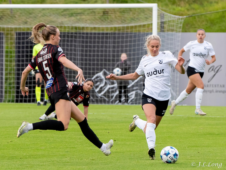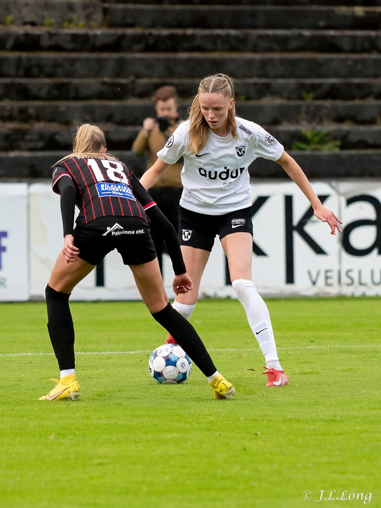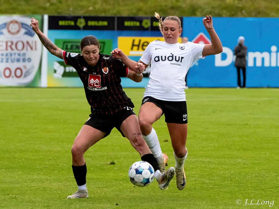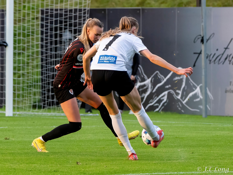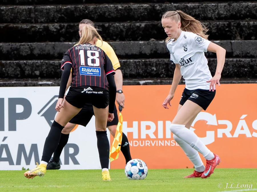 Margrét Brynja kemur boltanum í gegn á Mayu Hansen sem nýtir þetta færi ekki vel og tapar boltanum